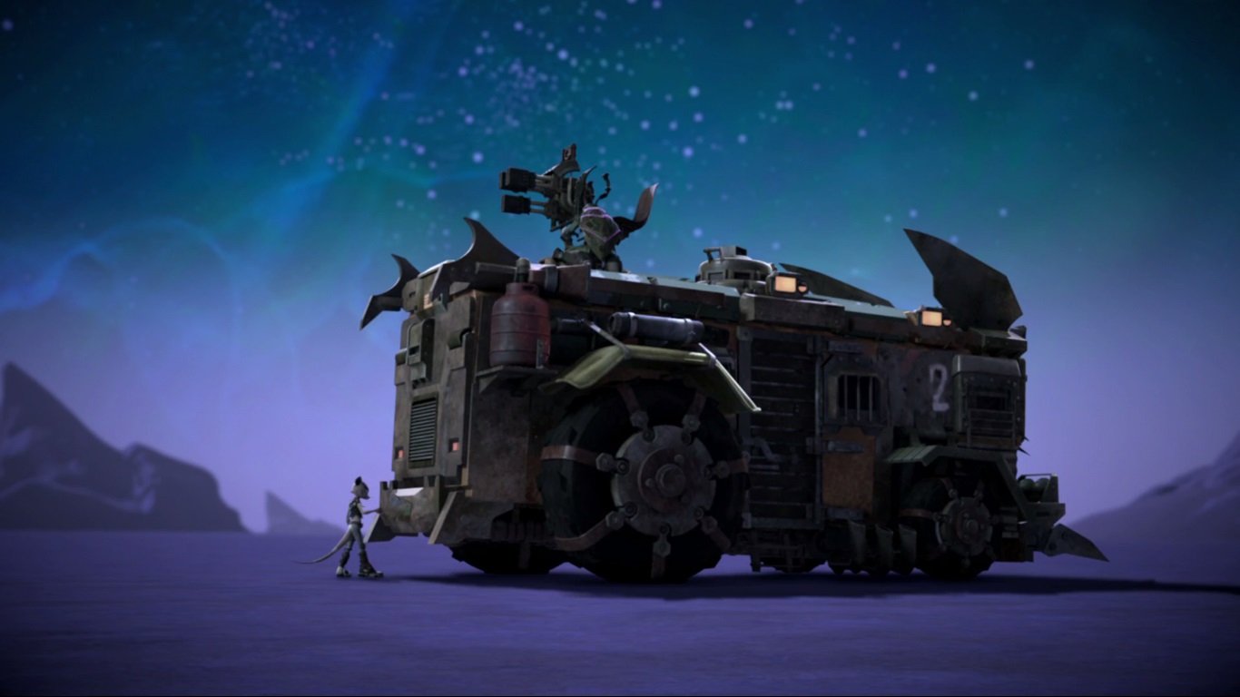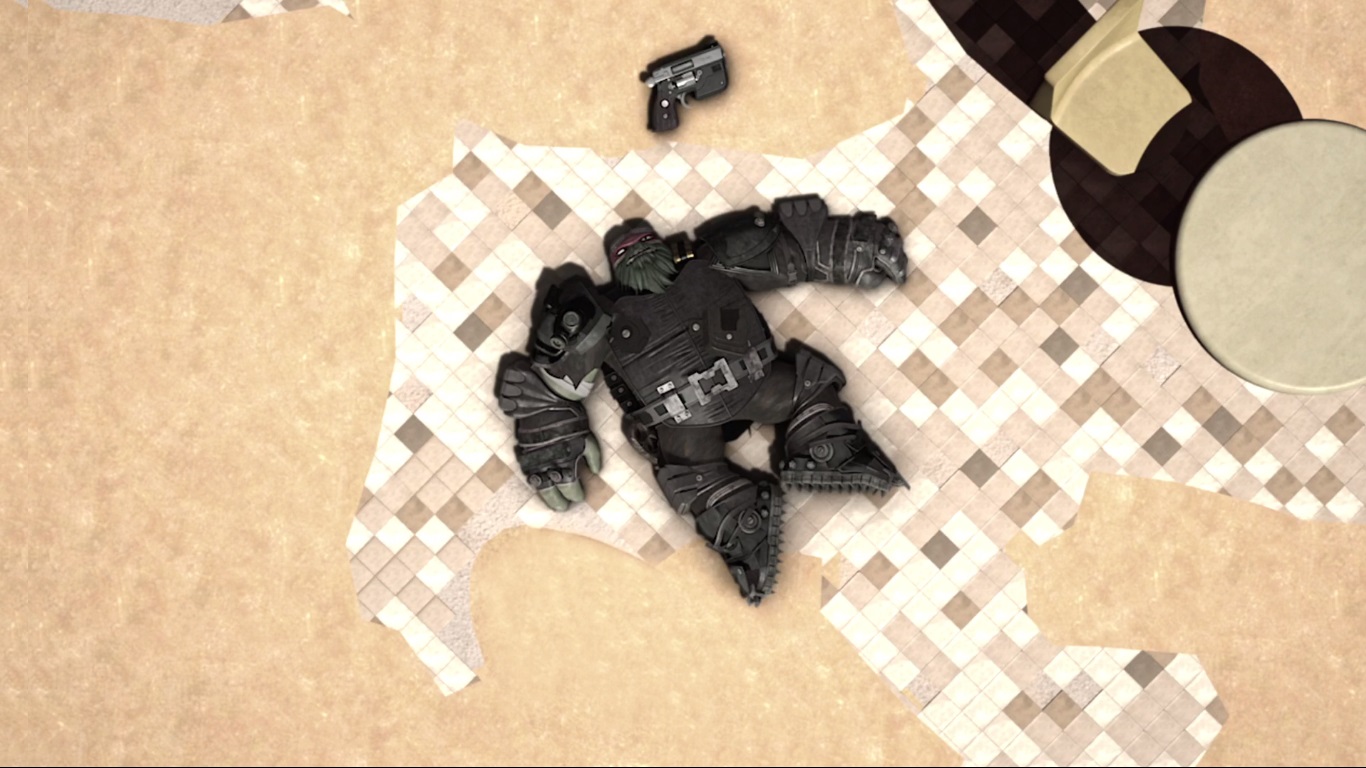 À l’approche de ruines, la tortue arrêtait son véhicule blindé un instant dans l’espoir de trouver de l’eau. Il s’agissait d’un vieux restaurant ; hélas, ces quelques bribes de murs ne renfermaient plus rien depuis bien longtemps. Assis sur une chaise, le mutant ressentait une présence étrangère. Il sortait son arme laser et tirait sur une ombre qui se faufilait à travers les murs en ruine du bâtiment. Sautant derrière lui, la créature le ficelait de son fouet avant de lui lancer une forte décharge électrique qui le mettait au tapis pour un bon moment. La jeune femme, un suricate, montait à bord du Shellraiser et s’en allait aussitôt, laissant la tortue seule et immobilisée sous un soleil de plomb.