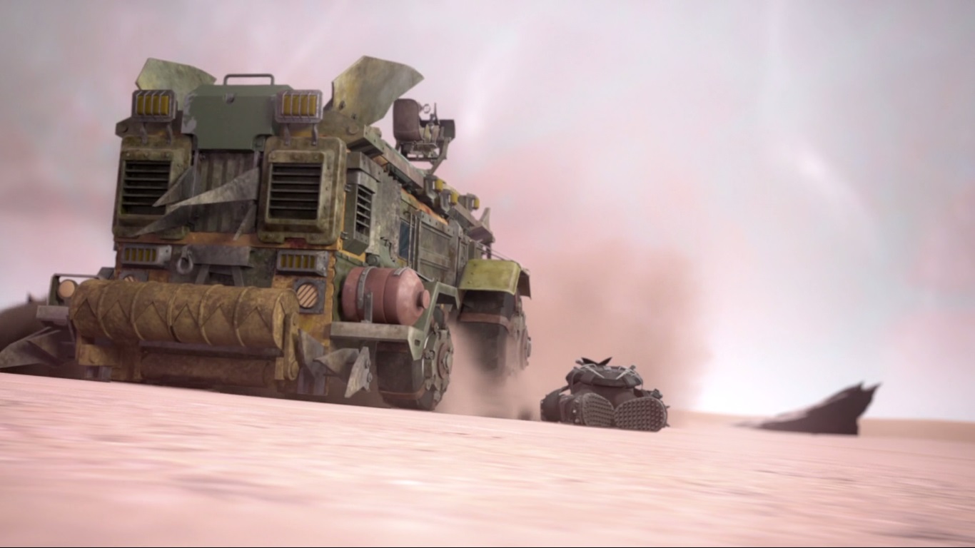 • La manière dont sont filmées certaines scènes, suivant un véhicule depuis son arrière jusqu’à son avant, puis poursuivre la caméra jusqu’aux héros en premier plan est typique des plans de Fury Road, mettant en valeur la taille et l’ingéniosité des constructions loufoques des bolides hybrides, comme le train citerne de Verminator Rex.