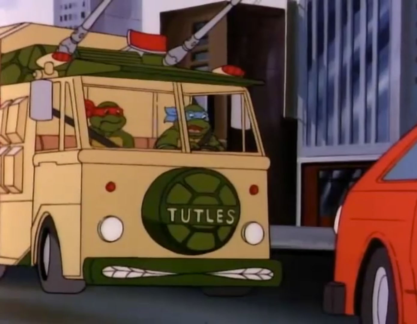 - Lorsque les tortues se retrouvent coincées dans les embouteillages, le logo des tortues à l’avant du Turtle van est écrit «Tutles » et non pas « Turtles ».