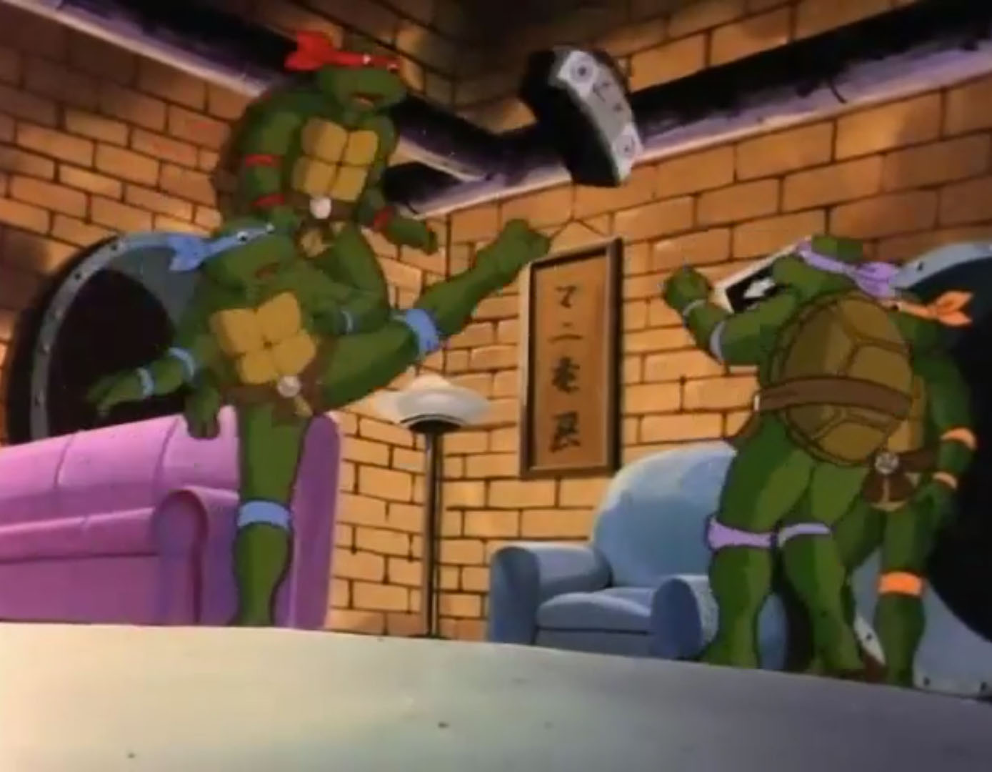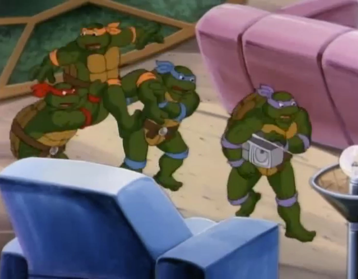 De retour au repaire, les tortues regardaient le reportage d’April qui annonçait que dorénavant, Dickie Bart changeait le style de musique diffusé. Au même moment, Michaelangelo entrait avec son nouveau poste de radio pour faire écouter quelque chose à ses frères. Sans attendre, les trois tortues sautaient sur son appareil pour le détruire. Ils se trompaient, ce n’était pas de la musique que la tortue voulait leur faire entendre. Mais une annonce publicitaire ! Woof s’était associé à la pizzeria Vinnie. Pour une pizza achetée, l’autre était offerte ! Ils se sentaient bien bêtes de l’avoir détruite…