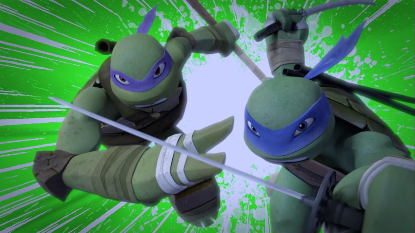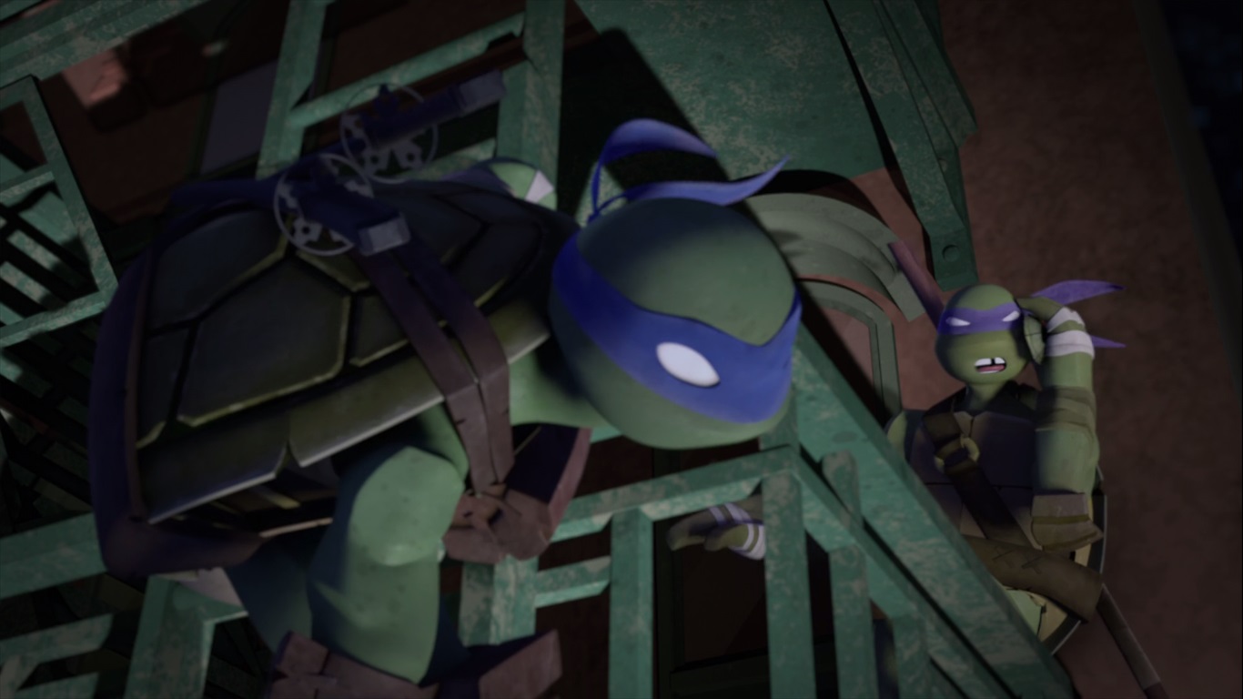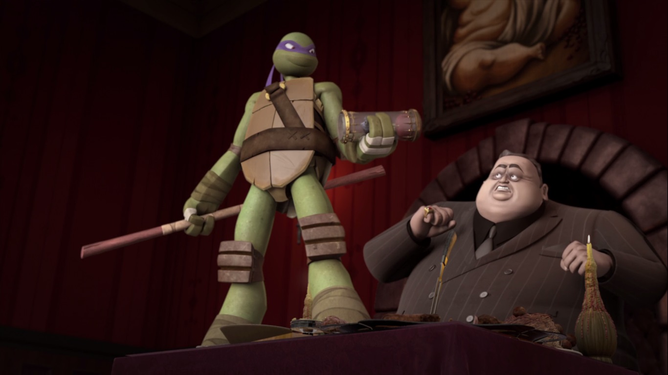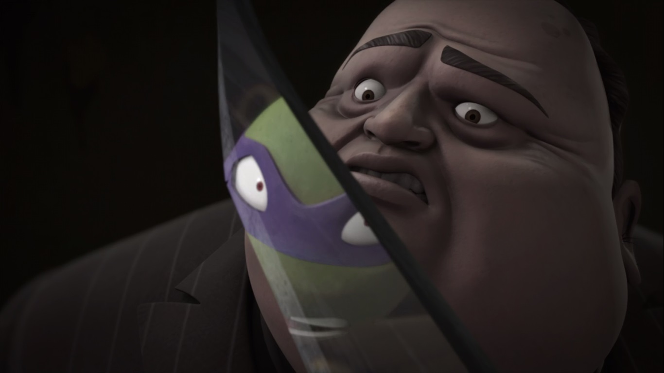 Donatello et Leonardo infiltraient l’hôtel. Éliminant les gardes uns à uns, ils arrivaient dans la pièce où était replié Vizioso. Tandis que l’un affrontait ses deux gardes, l’autre essayait de régler son compte à celui qui l’avait tant fait souffrir par le passé. Leonardo le suppliait de se ressaisir. Donatello plaquait Vizioso contre le mur et pointait la lame de sa naginata en sa direction. Soudain, il vit son reflet dans son arme et reprit ses esprits. Il n’était pas un assassin et lui promettait de terminer ses jours en prison. Les frères n’avaient pas le temps de savourer leur victoire. Kavaxas et Tiger Claw faisaient irruption et s’emparaient du flacon avec le cœur. Le démodragon sentait la puissance qui en émanait et s’en réjouissait déjà.