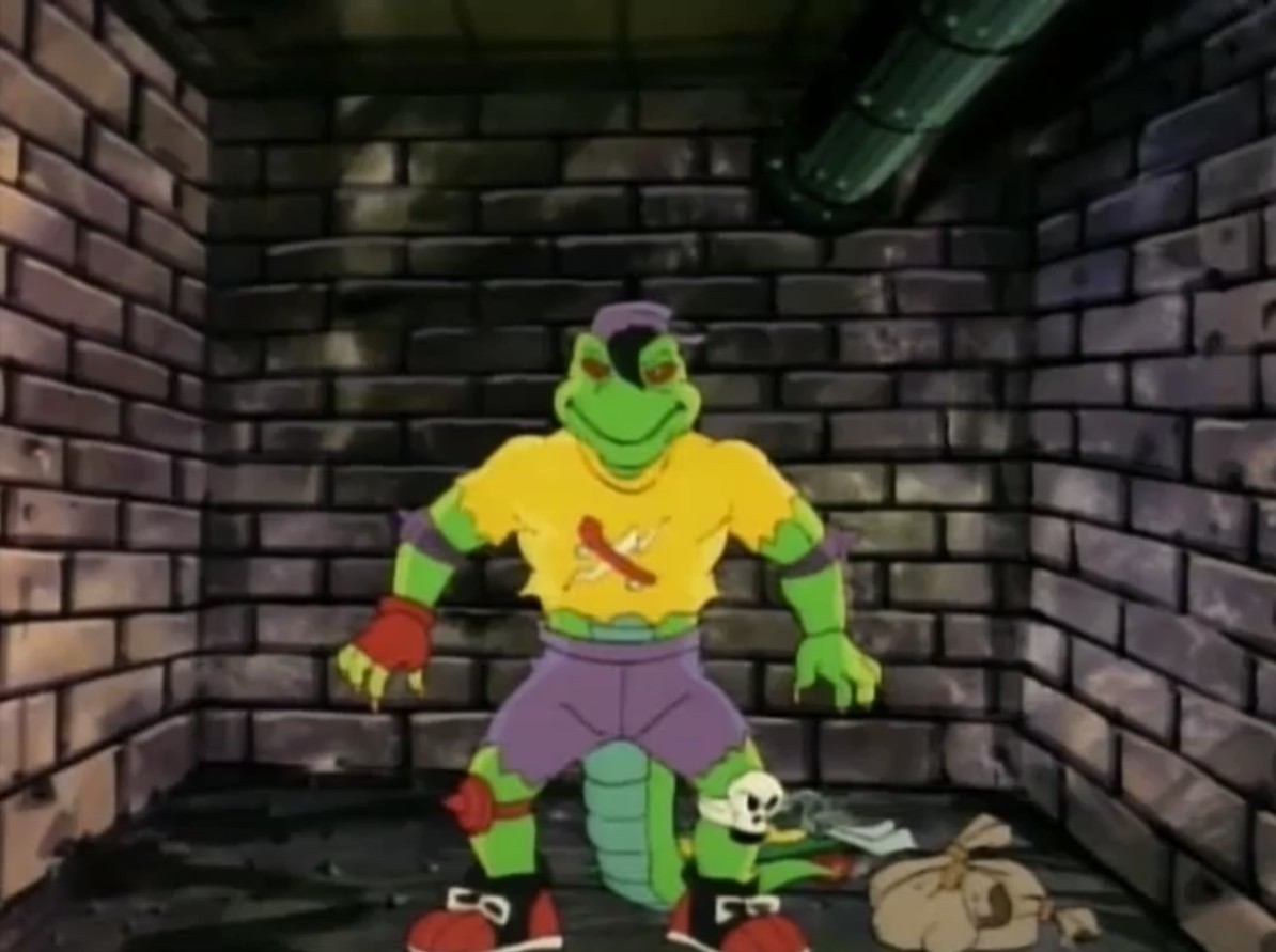 Redescendant dans les égouts, Michaelangelo était bousculé par un fou, revêtu d’un long manteau, sur un skate à moteur. Il reconnaissait l’individu, il s’agissait de l’un des trois hommes du braquage, plus tôt dans la matinée. Se lançant à sa poursuite, il ne tardait pas à l’appréhender dans un cul de sac des longs couloirs sombres. Retirant son manteau pour en découdre, l’individu révélait son identité : Mondo Gecko, un mutant ! Le lézard lui était familier.Engageant le combat, le gecko ne tardait pas à prendre l’avantage grâce à sa langue et ligotait Michaelangelo à un tuyau avant de prendre de nouveau la fuite avec son butin. Heureusement pour la tortue, il n’était pas compliqué de suivre les traces de Mondo Gecko. La piste le menait à un vieil entrepôt.