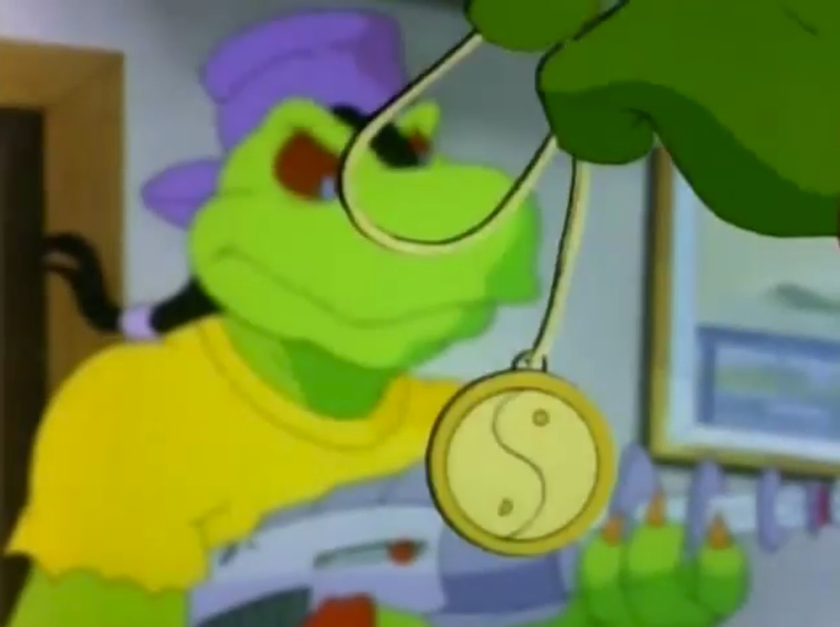 Avant de mourir, Michaelangelo demandait au lézard un dernier vœu. Lui tendant un pendentif, il lui demandait de le remettre à sa mère. Il l’agitait sous ses yeux pour l’hypnotiser comme le faisait Splinter. Bientôt, la tortue demandait au gecko de faire un retour à son enfance. Le gecko se souvenait nager dans un liquide bizarre avec quatre bébés tortues. Un homme, Monsieur X, venait l’enlever et l’élevait dans sa cachette. Il le formait pour devenir un voleur.