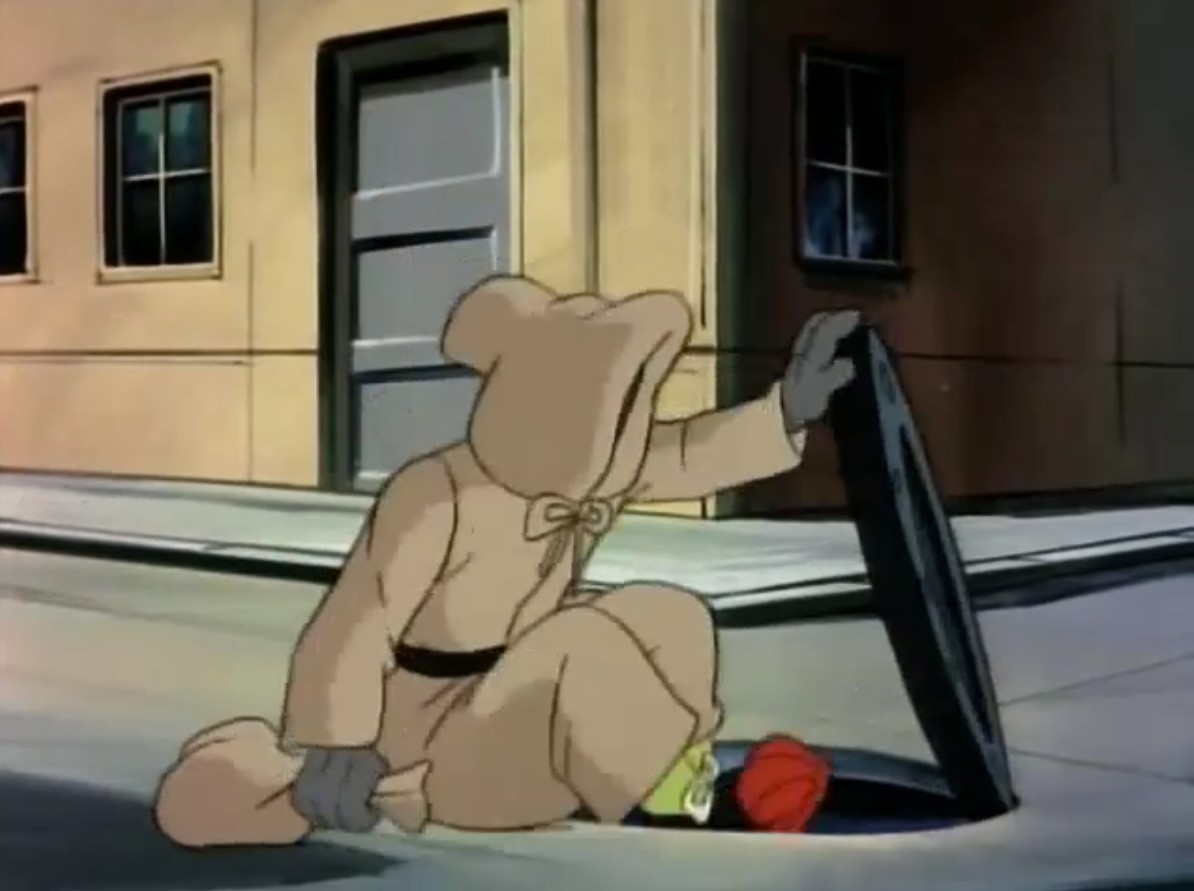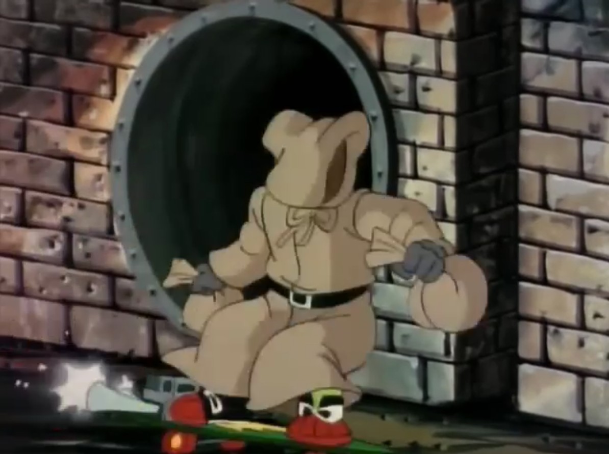 Une fois sur place, il entendit une sirène. Une banque était en train de se faire cambrioler à la surface. Trois hommes en sortaient. La tortue essaya de les arrêter, en vain ils étaient trop forts. L’un d’eux l’envoya dans une poubelle, leur permettant de fuir.