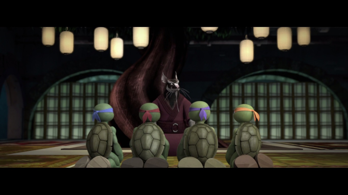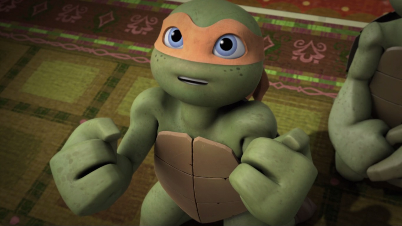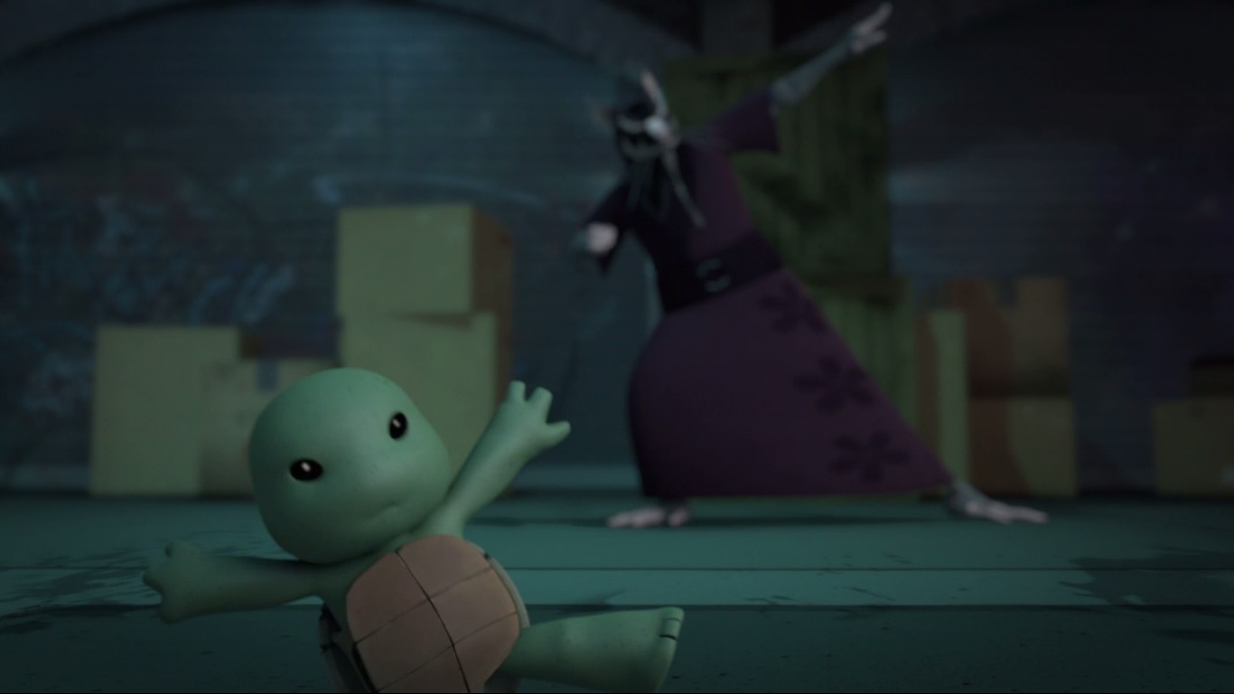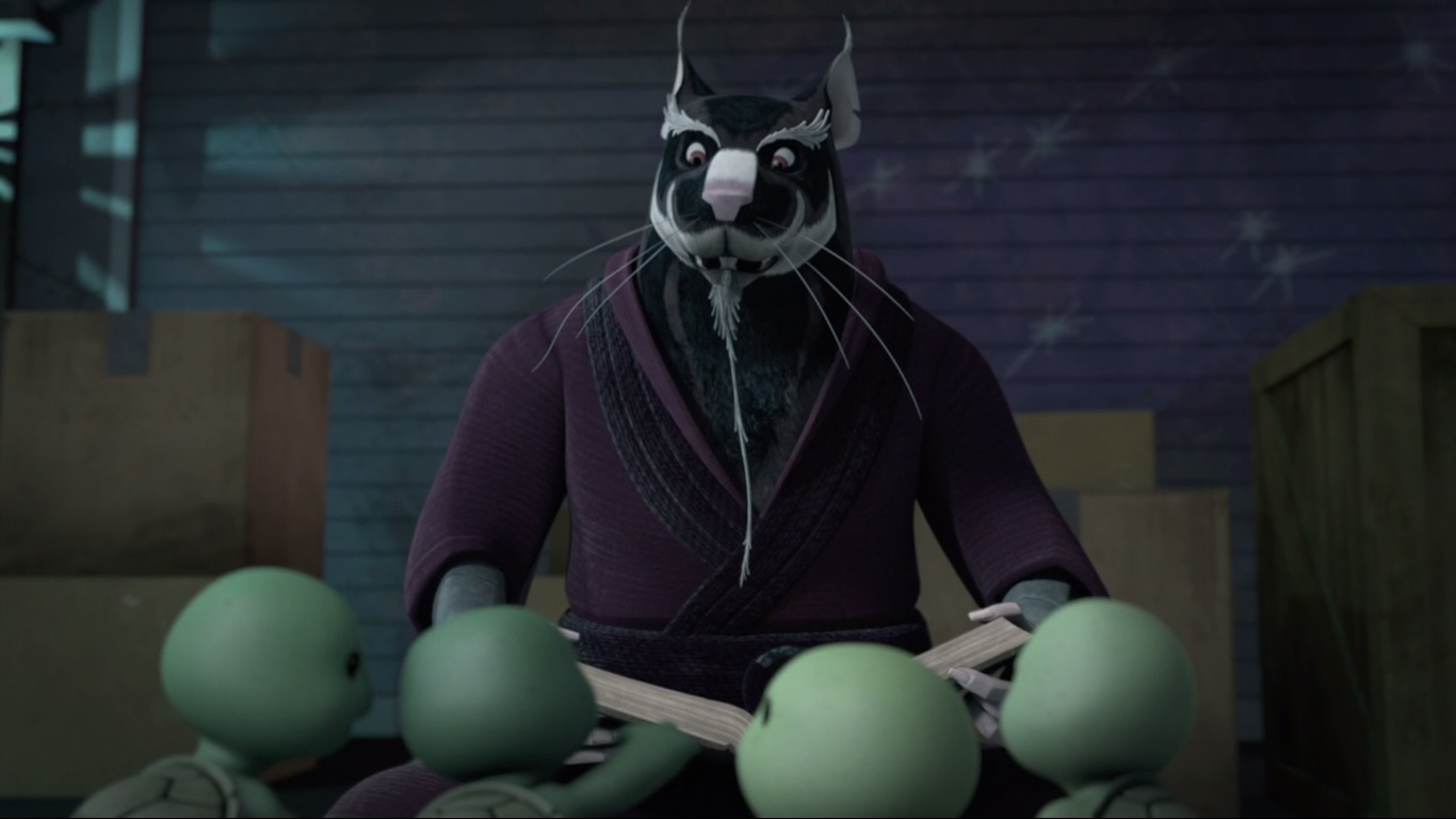 Mais à sa grande surprise, les tortues tendaient aussi à l’imiter, principalement lorsqu’il s’entraînait. Cela l’amusait beaucoup au début, puis il commença à prendre conscience de l’importance de cette attitude pour leur avenir. Hélas ces moments de paix et de bonheur prirent fin lorsque les kraangs retrouvèrent leur piste et attaquèrent l’entrepôt où les cinq mutants étaient réfugiés.