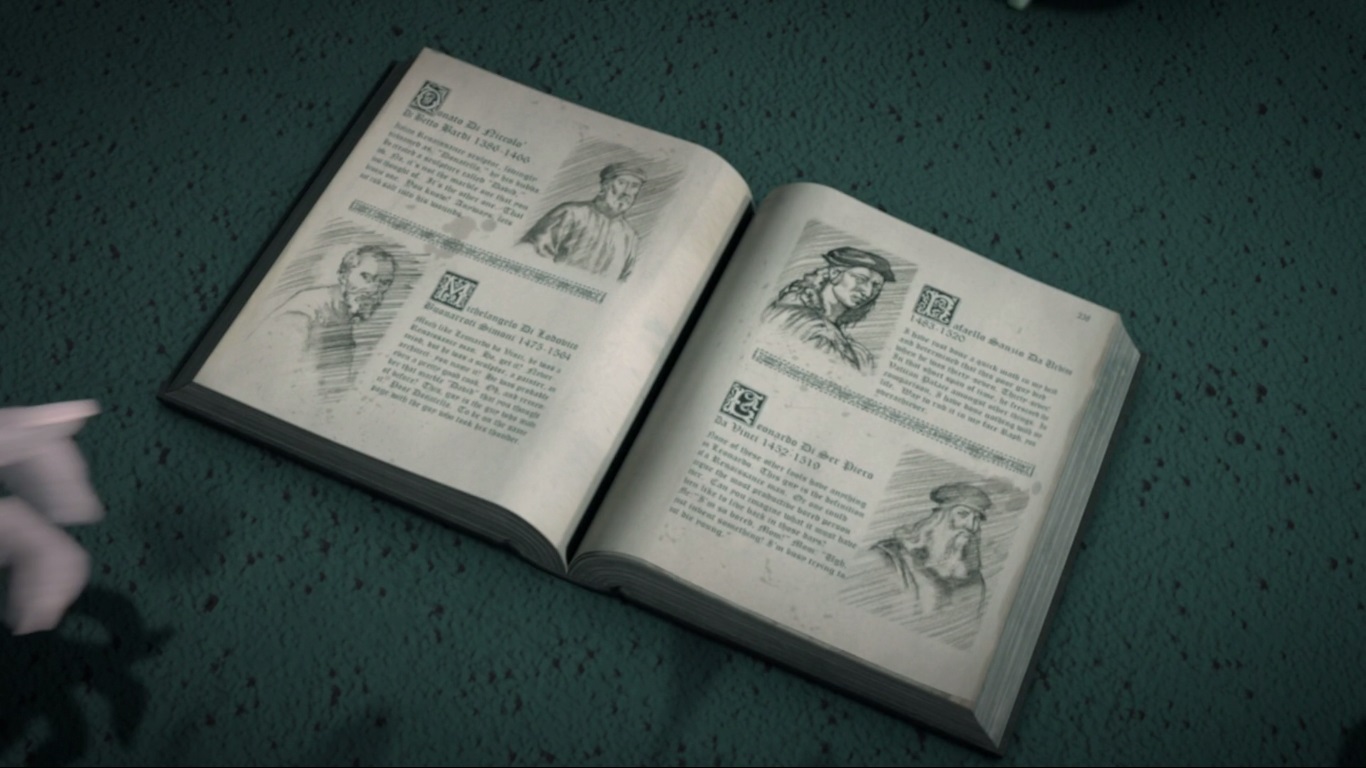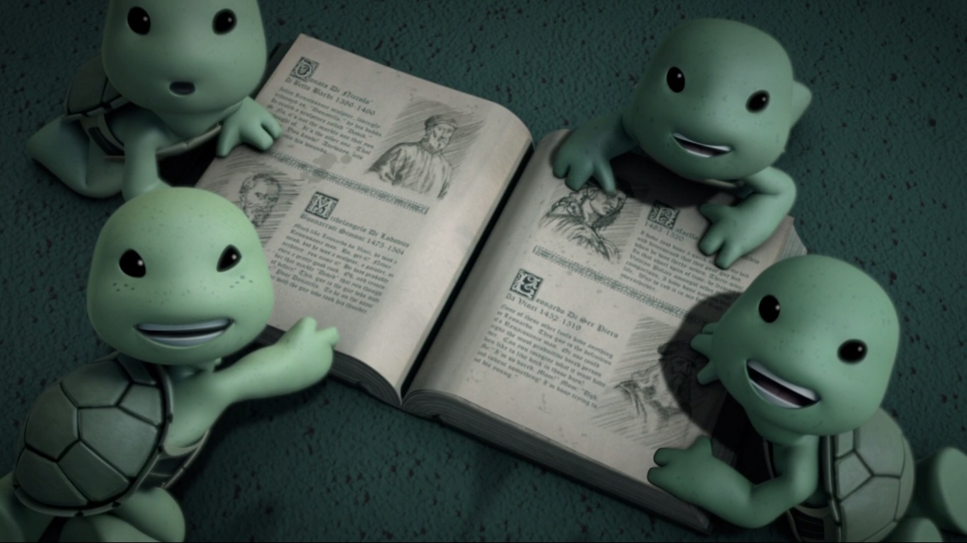 Il entrait dans un vieil entrepôt désaffecté. Telle serait leur nouvelle maison pour le moment. Mais les enfants étaient turbulents, ne laissant pas de répits au rat. Il devenait clair que les cinq mutants resteraient ensemble pour un long moment. Peut-être était-il donc venu le temps de leur trouver un nom ? Splinter prenait un livre sur la Renaissance, période artistique qu’il appréciait particulièrement, notamment du temps où il rêvait de devenir un artiste. Il déposait l’ouvrage devant les reptiles sur une double page avec les noms de quatre artistes bien connus de cette époque. Chaque tortue s’avançait vers l’image qui illustrait la description de ceux-ci. Ainsi naquirent les noms de Donatello, Michelangelo, Raphael et Leonardo.