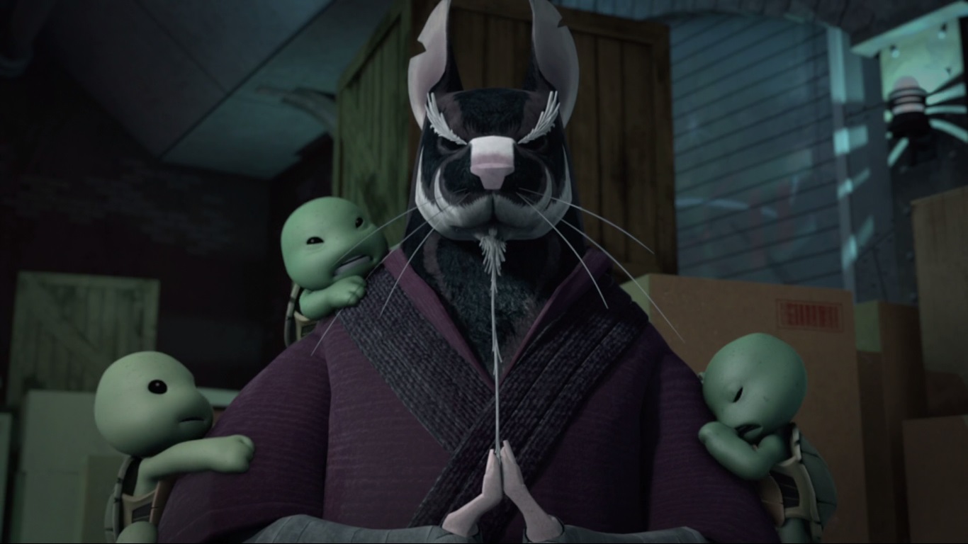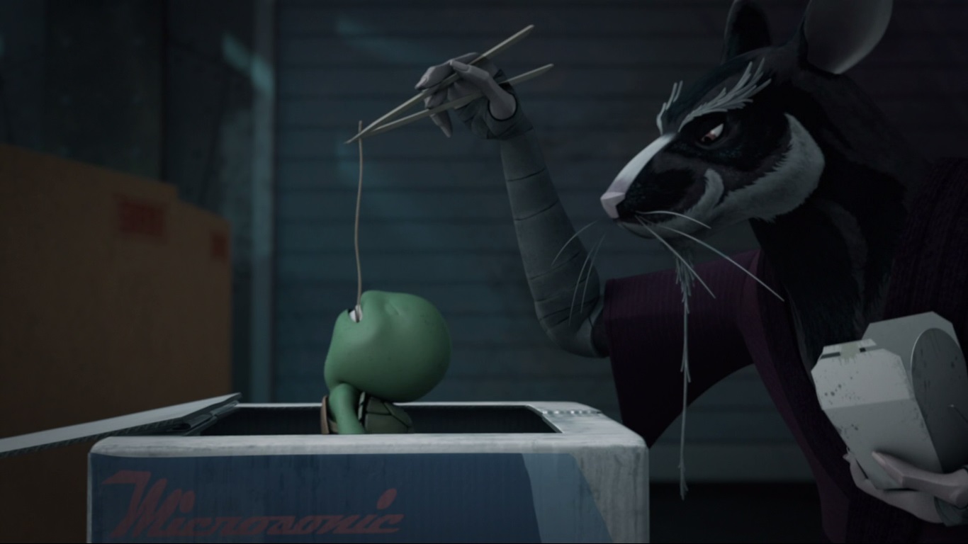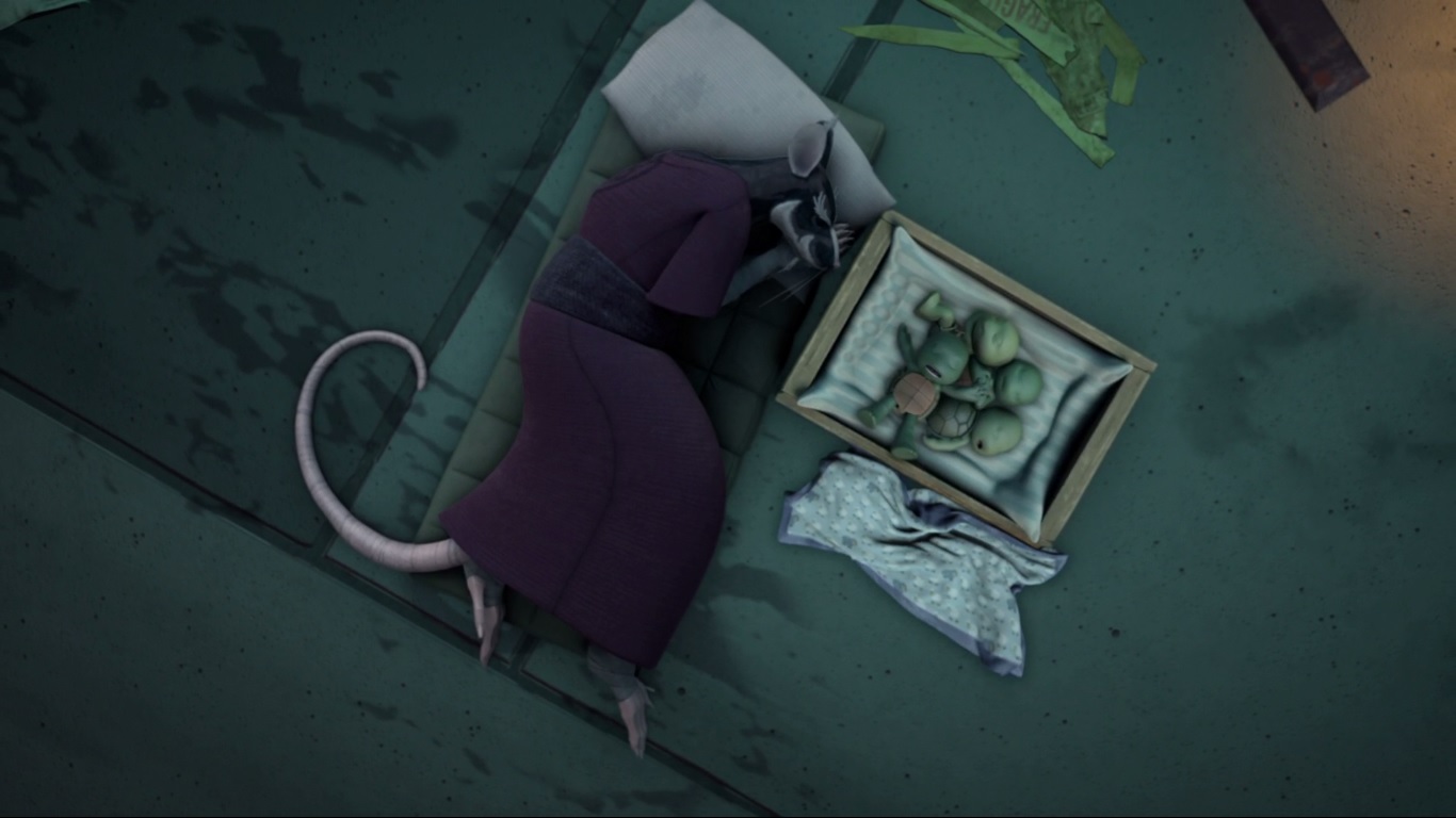 Le rongeur rentrait sur ses gardes dans la cachette qu’il avait emménagée dans un château d’eau. Soulevant une plaque de tôle ondulée pour y entrer, l’intérieur était un véritable taudis. Au centre se trouvaient les quatre petites créatures qu’il avait récemment achetées dans une boutique. Les bébés avaient pris forme humanoïde. Après leur avoir donné les quelques restes de nourriture qu’il avait pu trouver dans la rue, il regardait la photo qu’il gardait précieusement de lui et de Tang Shen avant de se lamenter sur son sort. Qu’avait-il fait pour mériter un tel châtiment se demandait-il ? Plus les petits grandissaient et plus il s’attachait à eux. Les regardant manger, soudain il entendit du bruit à l’extérieur. Pour venir jusqu’ici, il avait dû rivaliser d’ingéniosité pour se défaire d’une sphère de surveillance kraang. Elle n’était pas loin. Couvrant la lampe qui produisait la seule source lumineuse dans le château d’eau, il se tenait sur ses gardes, prêt à user de son katana. La machine volante lançait un scanner de la structure avant de s’en aller sans le moindre résultat.