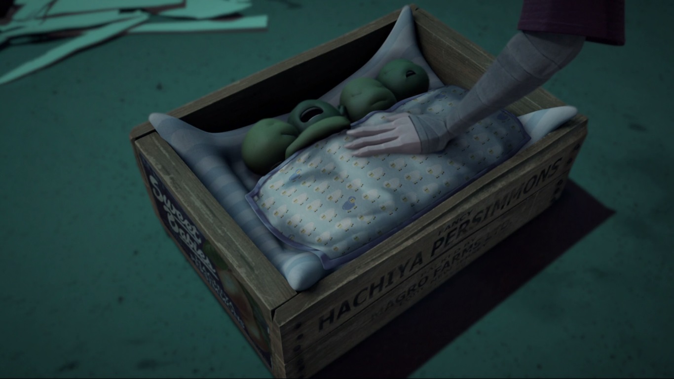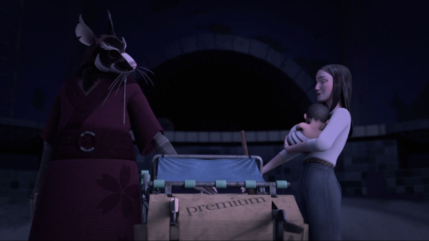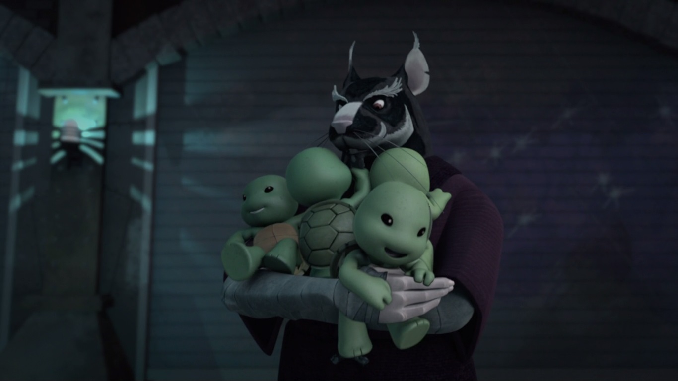 Le rongeur rentrait sur ses gardes dans la cachette qu’il avait emménagée dans un château d’eau. Soulevant une plaque de tôle ondulée pour y entrer, l’intérieur était un véritable taudis. Au centre se trouvaient les quatre petites créatures qu’il avait récemment achetées dans une boutique. Les bébés avaient pris forme humanoïde. Après leur avoir donné les quelques restes de nourriture qu’il avait pu trouver dans la rue, il regardait la photo qu’il gardait précieusement de lui et de Tang Shen avant de se lamenter sur son sort. Qu’avait-il fait pour mériter un tel châtiment se demandait-il ? Plus les petits grandissaient et plus il s’attachait à eux. Les regardant manger, soudain il entendit du bruit à l’extérieur. Pour venir jusqu’ici, il avait dû rivaliser d’ingéniosité pour se défaire d’une sphère de surveillance kraang. Elle n’était pas loin. Couvrant la lampe qui produisait la seule source lumineuse dans le château d’eau, il se tenait sur ses gardes, prêt à user de son katana. La machine volante lançait un scanner de la structure avant de s’en aller sans le moindre résultat.
