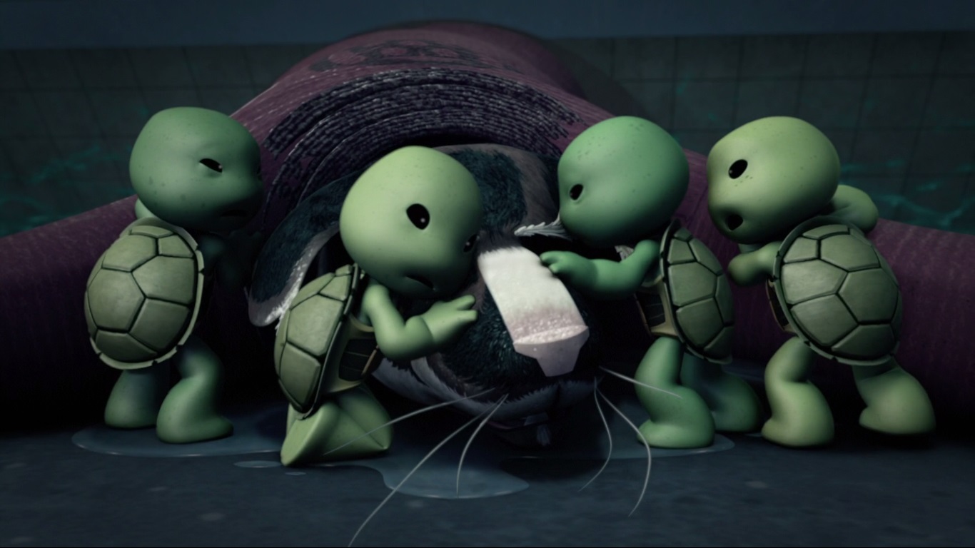 - Ce n’est pas la seule incohérence. Lorsqu’il affronte les robots envahisseurs dans cet épisode, Splinter n’a aucun mal à les repousser jusqu’à découvrir leur origine. Dans l’épisode L’apparition des tortues (S1 E1), lors de leur premier combat, les tortues sont certes encore très inexpérimentées, mais ont beaucoup de mal à repousser les assaillants, ne serait-ce que par leur poids. Un détail qui va très rapidement disparaître pour la fluidité du récit.
