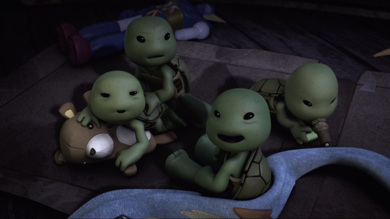 - Par ailleurs, Playmates Toys s’était déjà aventuré sur ce terrain en 2013 en sortant deux packs, Leo & Don ninjas in training et Raph & Mike ninjas in training. Si l’illustration au dos des blisters montrait que les bébés tortues avaient déjà été modélisés, ce n’est que dans cet épisode qu’ils apparaissent pour la première et unique fois.