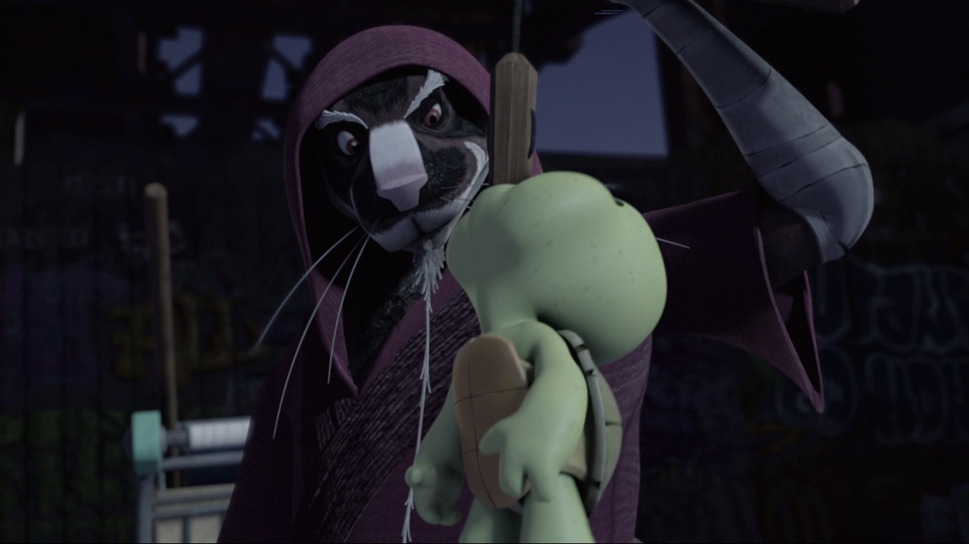 Splinter partait avec ses fils, embarqués dans un caddie, vers une bouche de métro. Les souterrains étaient son domaine, pouvant se cacher et attaquer par surprise, il réglait leur compte à quelques kraangs avant de tenter de prendre une nouvelle fois la fuite par les escaliers. Mais un jitte était pris dans la roue du caddie. Essayant de l’en extraire, il était interrompu par une sphère de surveillance. Trop occupé à la neutraliser, il n’avait pas prêté attention au charriot qui dévalait les escaliers. Raphael, penché en avant vers la poignée, en était expulsé et la roue du caddie passait sur sa carapace. Courant au chevet de son fils, la tortue était indemne, mais un morceau de son plastron se décrochait. Splinter, de rage, réduisait la machine en charpie sous le regard terrifié de ses fils – sauf Raphael qui s’amusait toujours à imiter les gestes de son père.