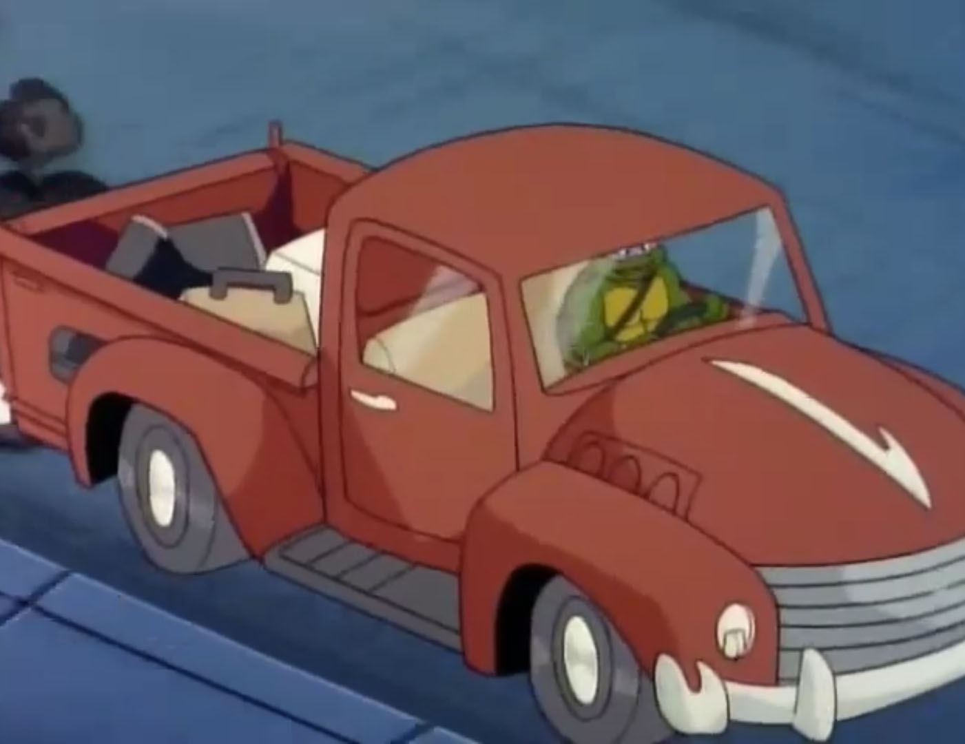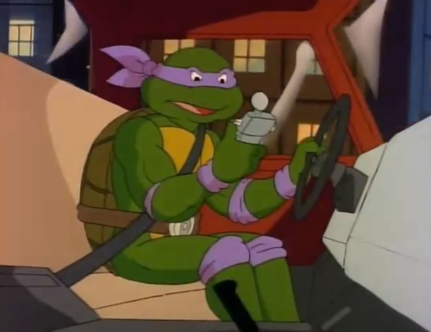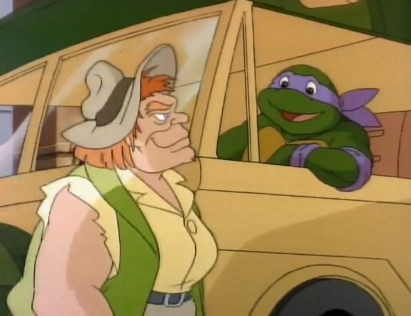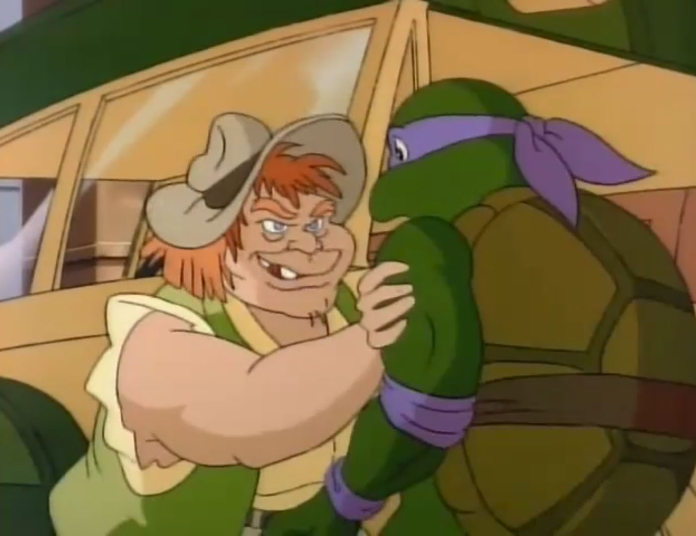 Coincé à côté du moteur du vieux véhicule, Donatello faisait pression sur le capot à l’aide de sa carapace pour le faire voler. Une fois libéré, il retournait dans son garage pour réparer l’épave. C’était le seul moyen pour retrouver les voleurs et récupérer le Turtle van. Bedelia et ses fils étaient ravis de leur prise et découvraient toutes les possibilités que leur offrait le camion de combat. Filant à toute vitesse à travers les rues, la police se mettait vite à leurs trousses. Bubba, aussi insupportable que stupide, continuait de toucher à tous les boutons et déclenchait un parachute qui freinait le camion.