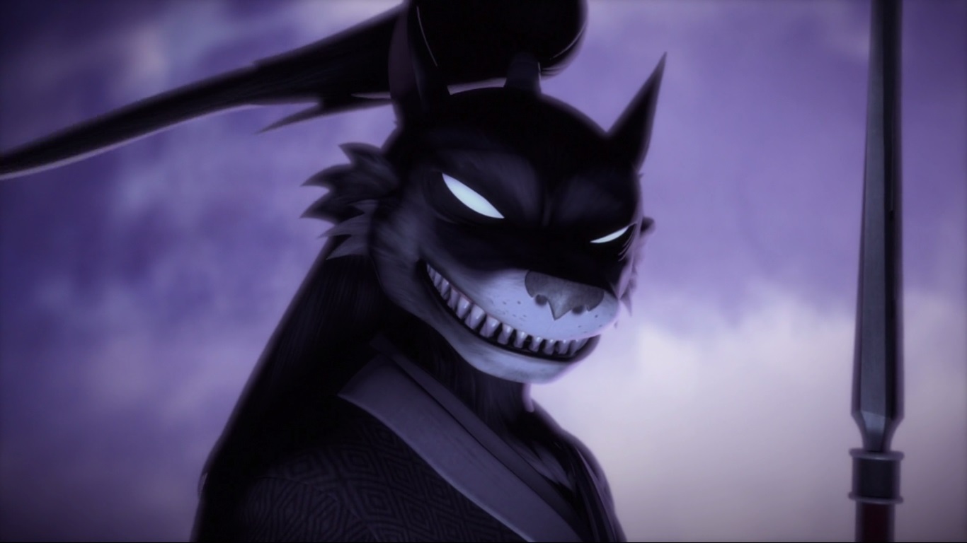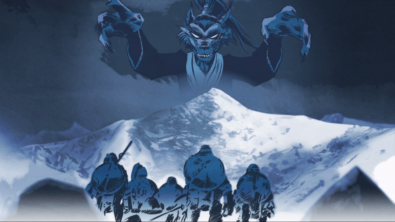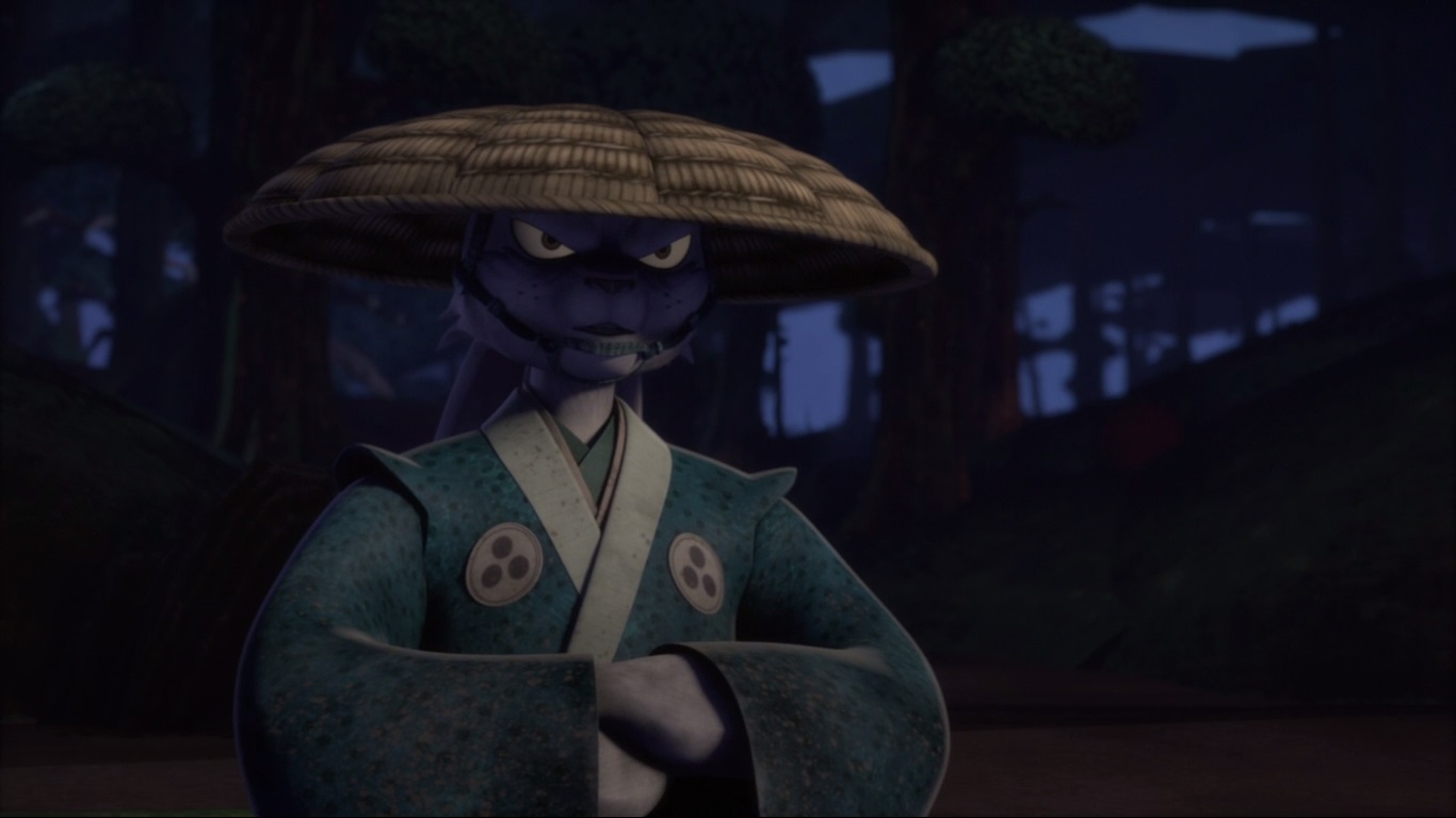 Les six compagnons s’engouffraient dans une forêt sinistre. Il s’agissait de l’unique passage pour accéder au temple, ce qui déplaisait fortement à Kintaro, peu rassuré par le lieu soi-disant hanté. Poursuivant leur route de nuit, Leonardo était d’avis à ce que la compagnie s’arrête pour y dresser un campement. Le lapin rōnin n’était pas de cet avis. Ils étaient sur le domaine des yokais, ils ne devaient pas s’y attarder.