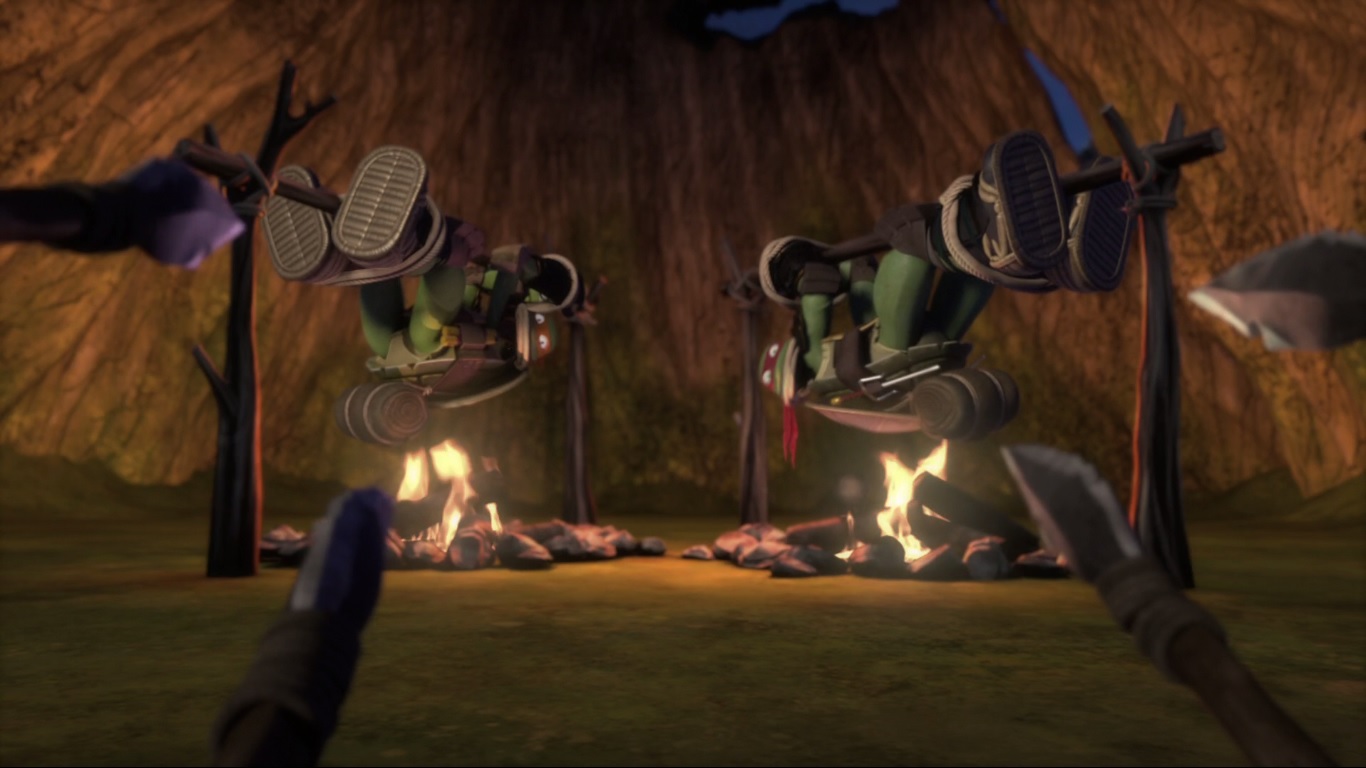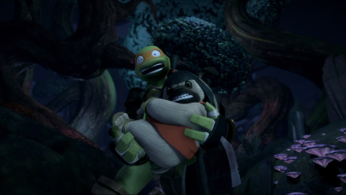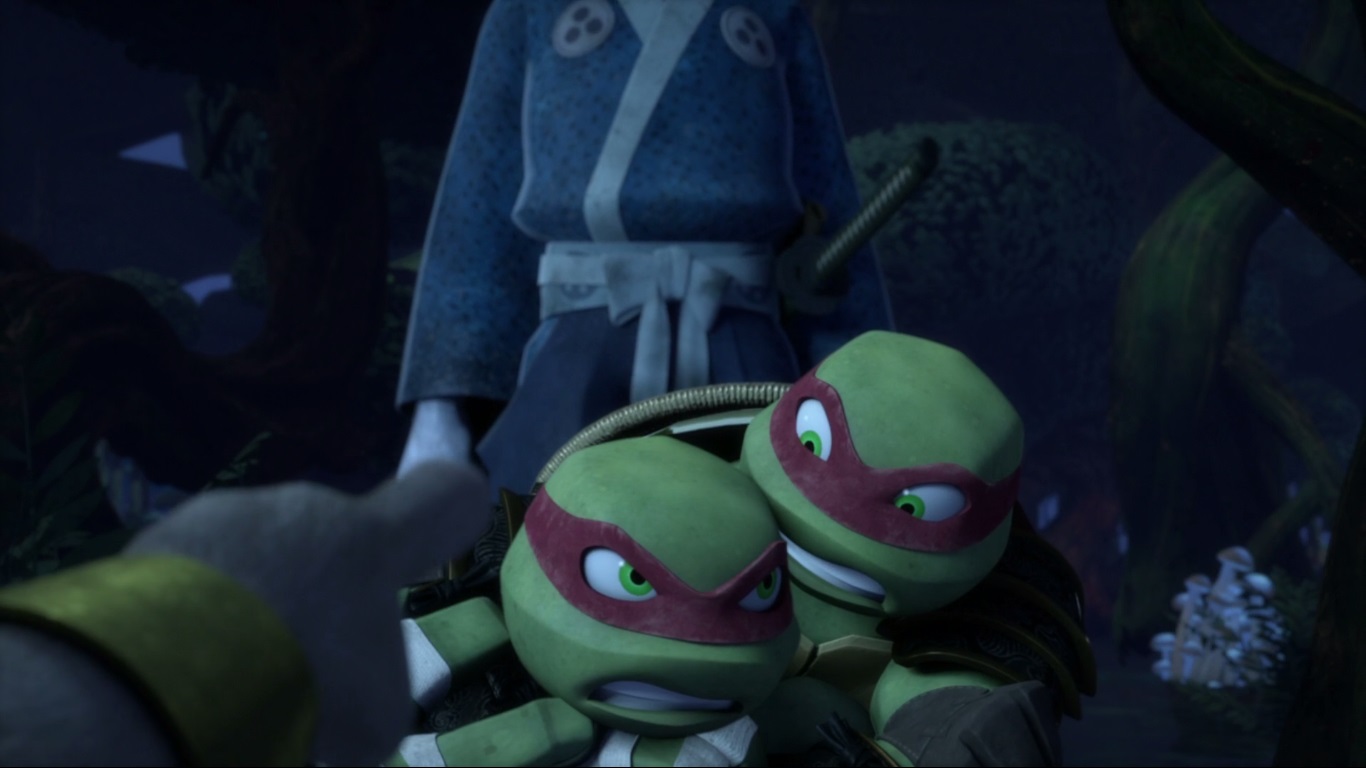 Ce n’est pas la première fois que les scénaristes jouent avec le corps de Raphael, lui donnant une tête ou un corps de tanuki avec sa tête. Déjà lors de l’épisode Les mutants du labyrinthe (S2 E15), ils l’avaient fait se changer en tortue-dinde.