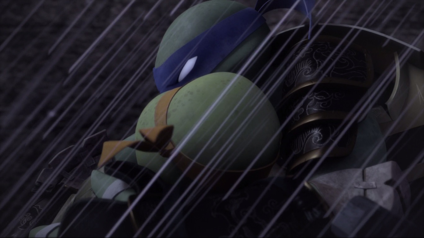 Tous s’endormaient rapidement après cette journée épuisante. Leonardo commençait lui aussi à piquer du nez. Il se ressaisissait au moment d’apercevoir Jei, éclairé par la lune, sur une falaise voisine. La tortue réveillait immédiatement ses compagnons pour se préparer au combat. Contre toute attente, le loup s’était évaporé. Il réapparaissait finalement au-dessus d’eux, attaquant de sa lance noire. Michelangelo lui sautait dessus et se retrouvait empalé sur l’arme du loup. Ce dernier se débarrassait de son corps en le faisant tomber le long de la paroi rocheuse. Raphael était le suivant, arrêté par une poudre explosive. Levant la main en direction de Donatello, Jei le soulevait dans les airs puis lui faisait subir une terrible étreinte avant de le lâcher dans le vide. Leonardo voyait ses frères se faire tuer les uns derrière les autres et tomber dans le vide. Poussé