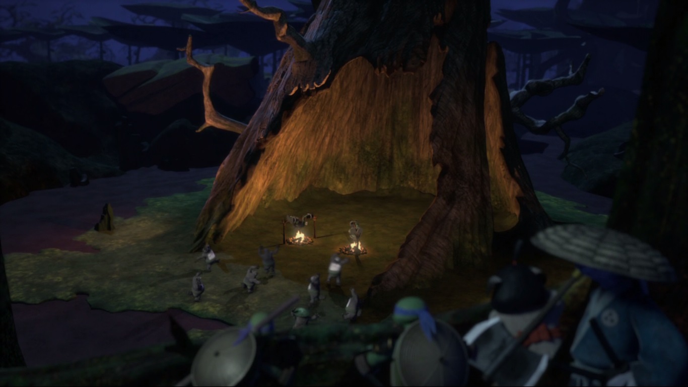 La compagnie partait à la recherche de ces mystérieuses créatures, et ainsi espérer retrouver les tortues manquantes. Usagi et Kintaro arrivaient non loin d’un grand arbre servant de cachette à une petite communauté de tanukis. Un feu avait été allumé où Raphael et Michelangelo rôtissaient au-dessus d’une structure aménagée de branchages. Malgré les avertissements du lapin rōnin, Leonardo et Donatello partaient sauver leurs frères.