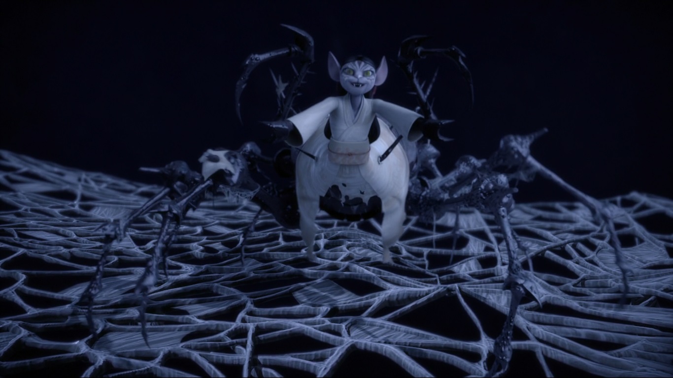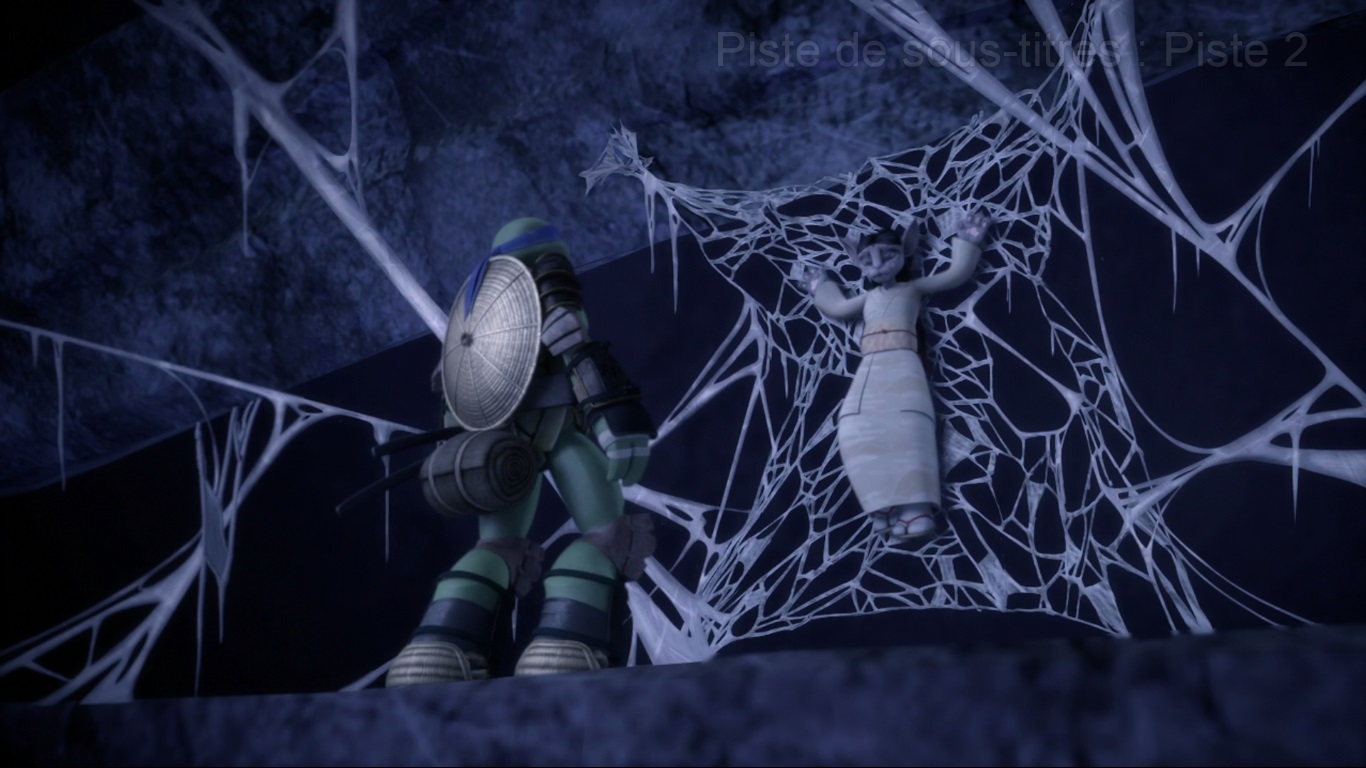 Sans réfléchir, Leonardo fonçait tête baissée pour l’en délivrer. Le lapin, fort de son expérience et de son monde, préférait rester sur ses gardes et mieux observer les lieux. Sous ses pieds se trouvait un gouffre obstrué par des toiles bien plus nombreuses et grandes que jusqu’alors. De son couteau, la tortue délivrait la prisonnière qui lui tombait dans les bras. Sa voix changeait très rapidement et des pattes velues sortaient de ses manches. Leonardo était pris dans l’étreinte d’une créature arachnide et ne pouvait s’en dépêtrer. Usagi sautait sur les plateformes pour rejoindre la victime et faire fuir la créature à temps. Les quatre autres compagnons étaient restés en retrait. Avançant prudemment, l’araignée les rattrapait discrètement. Elle capturait Donatello pour le jeter dans sa toile gigantesque en contrebas. La tortue se rattrapait de justesse avec son bō et voyait qu’elle n’était pas la seule à être tombée dans le piège, d’autres individus y étaient morts depuis longtemps.