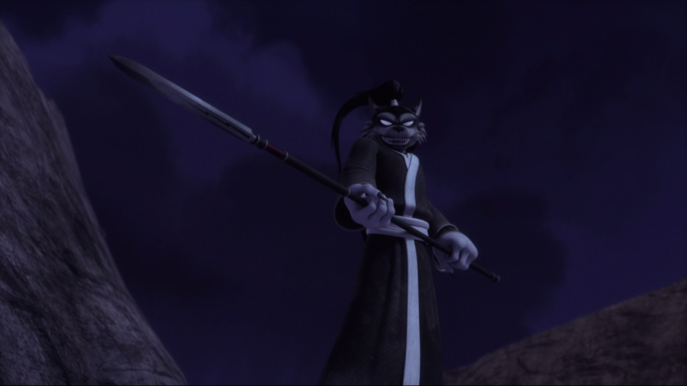 à son tour le long de la paroi, il retrouvait ses frères en contrebas et pleurait au chevet de leur corps sans vie. Puis de rage, il saisissait son sabre pour livrer à un combat mortel face à un Jei quasi-invulnérable. Il avait beau essayer ses plus difficiles coups, le loup le surpassait à chaque instant jusqu’à le jeter au sol. Brandissant sa lance, Leonardo s’attendait à connaître le même sort que ses frères.