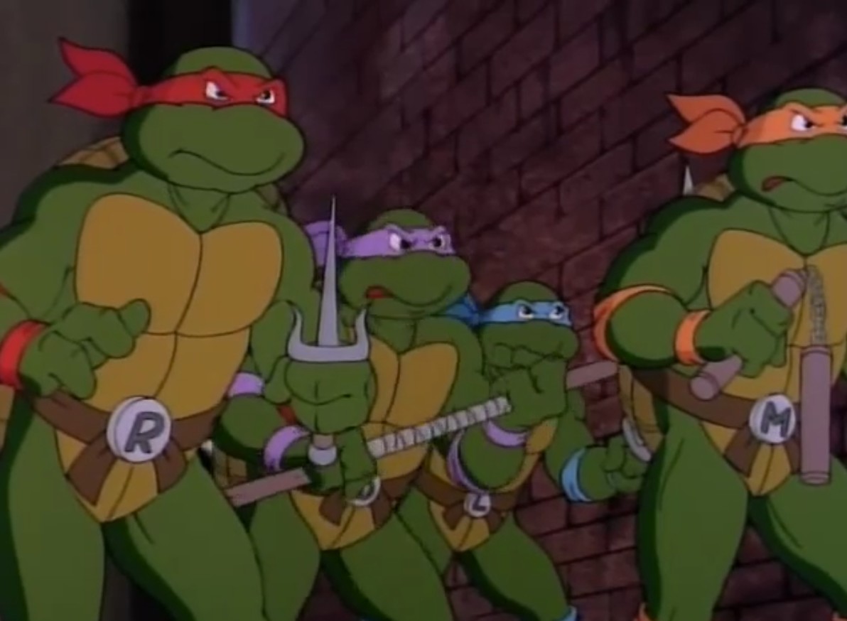 - Malgré les restrictions quant à l’apparition des nunchakus de Michaelangelo dans la série, principalement pour l’exportation européenne, le ninja tient ses armes à l’écran lorsque les tortues essaient de prendre Muckman et Joe Eyeball par surprise, alors qu’ils s’en prennent à April et Irma.