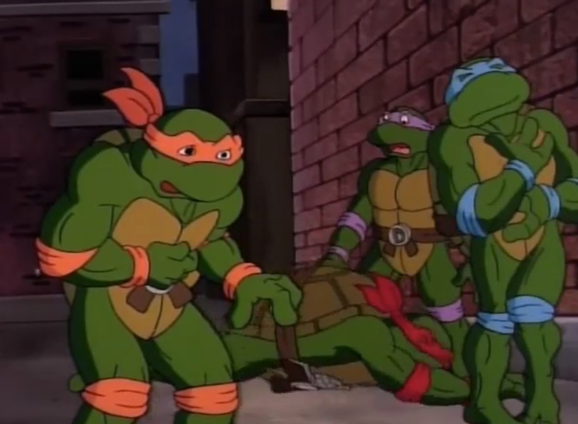 C’est alors que Shredder et Muckman faisaient irruption et comme la fois précédente, les quatre reptiles s’effondraient au sol, totalement affaiblis. Bientôt, l’homme tenait en joue les tortues, demandant à Splinter de se rendre. Le rat s’exécutait. Shredder fustigeait et demandait à ses deux sbires de mener le rongeur au Technodrome. Comme convenu, il laissait Muckman achever les tortues inoffensives. April avait une idée pour l’en empêcher. Elle lui proposait de la détacher et l’accompagner jusqu’au laboratoire Tropotron pour consulter les caméras de surveillance.