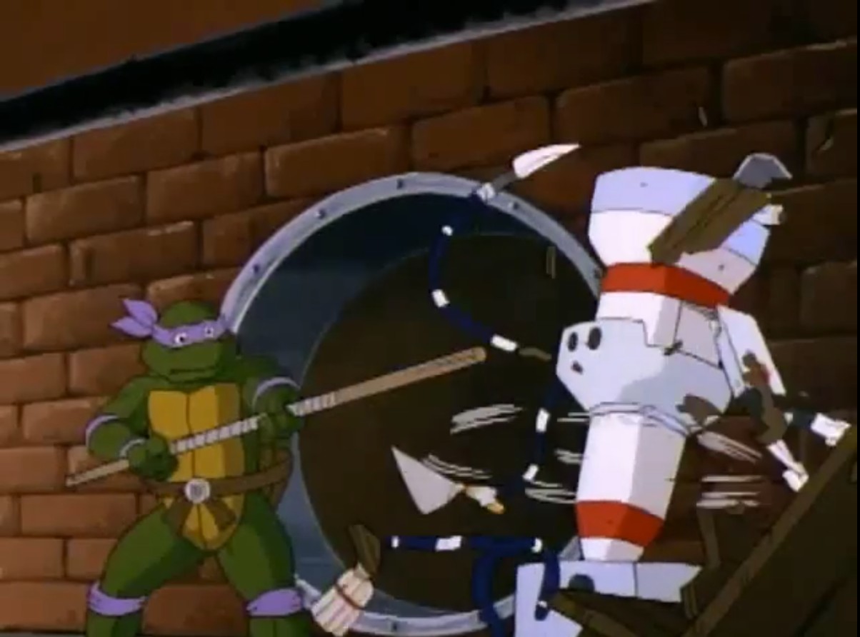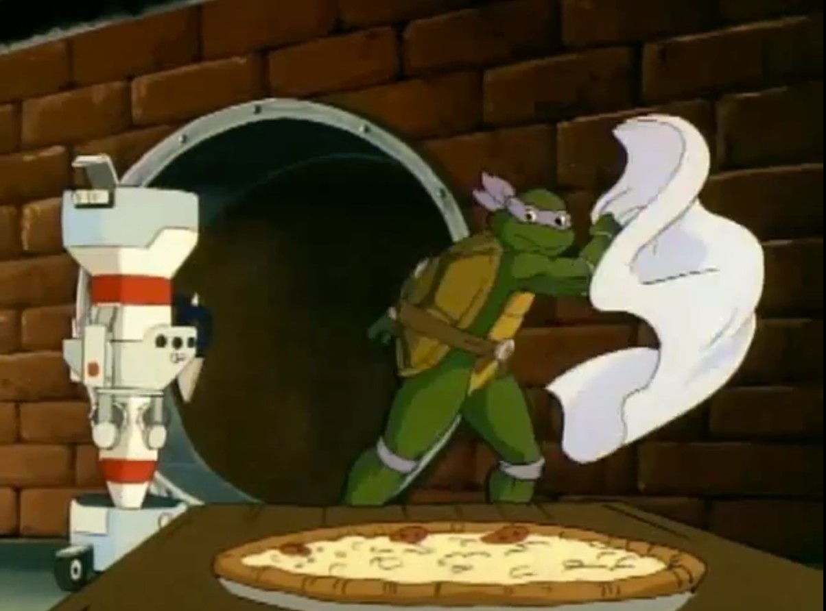Alors que Leonardo et Raphael allaient enfin pouvoir déguster les pizzas de Michaelangelo, Donatello les interrompait. C’était l’heure de présenter sa dernière invention : le robot découpeur de pizzas automatique ! Capable de découper une pizza en quelques secondes. Mais comme toutes les inventions du bricoleur, c’était un échec extrêmement dangereux. Déchiquetant les pizzas encore fumantes, Donatello l’arrêtait de son bâton. Le salon était sens dessus dessous…