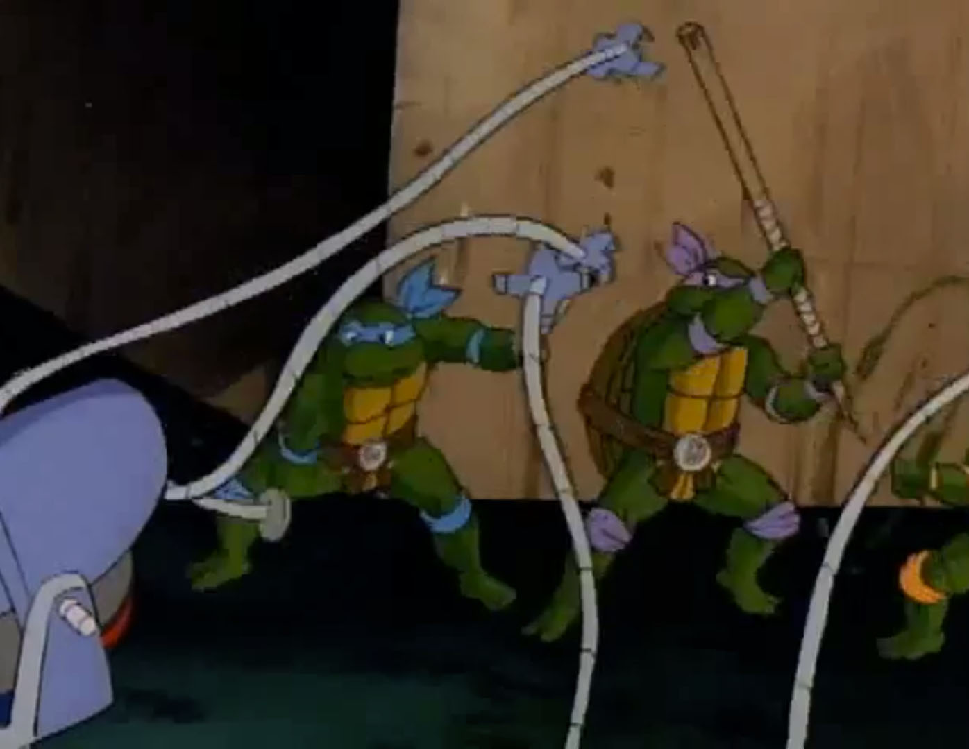 - Lors du combat contre le robot araignée, Donatello casse son bâton. Il l’utilise pourtant quelques minutes après contre la machine de von Volt.