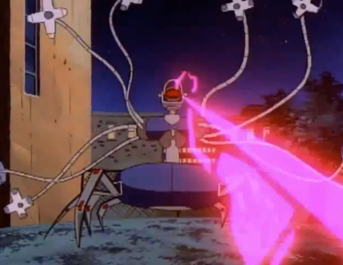 Le lieu était surveillé par des caméras. Le professeur von Volt envoyait un robot de défense se charger des intrus. La machine était puissante et tirait des lasers. Les tortues, averties, arrivaient très rapidement. Le portail défoncé à l’aide du Turtle van¸ la cavalerie se chargeait de la machine. Raphael lui envoyait son saï en plein visage. Mais un autre robot, à l’apparence d’araignée, faisait son apparition. Agatha Marbles utilisait une barre de fer pour atteindre l’épaule du robot déjà neutralisé pour l’orienter vers le laboratoire de von Volt. Les autres tortues se chargeaient du gardien à huit pattes. La machine était redoutable. Les frères ne parvenaient pas à prendre le dessus. Donatello brisait son bâton, Leonardo se faisait désarmer. Michaelangelo essayait de le ligoter de son grappin, mais il se faisait balader dans les airs. Finalement, la tortue parvenait à reprendre le dessus et détruisait la caméra de la machine, qui s’effondrait instantanément au sol.