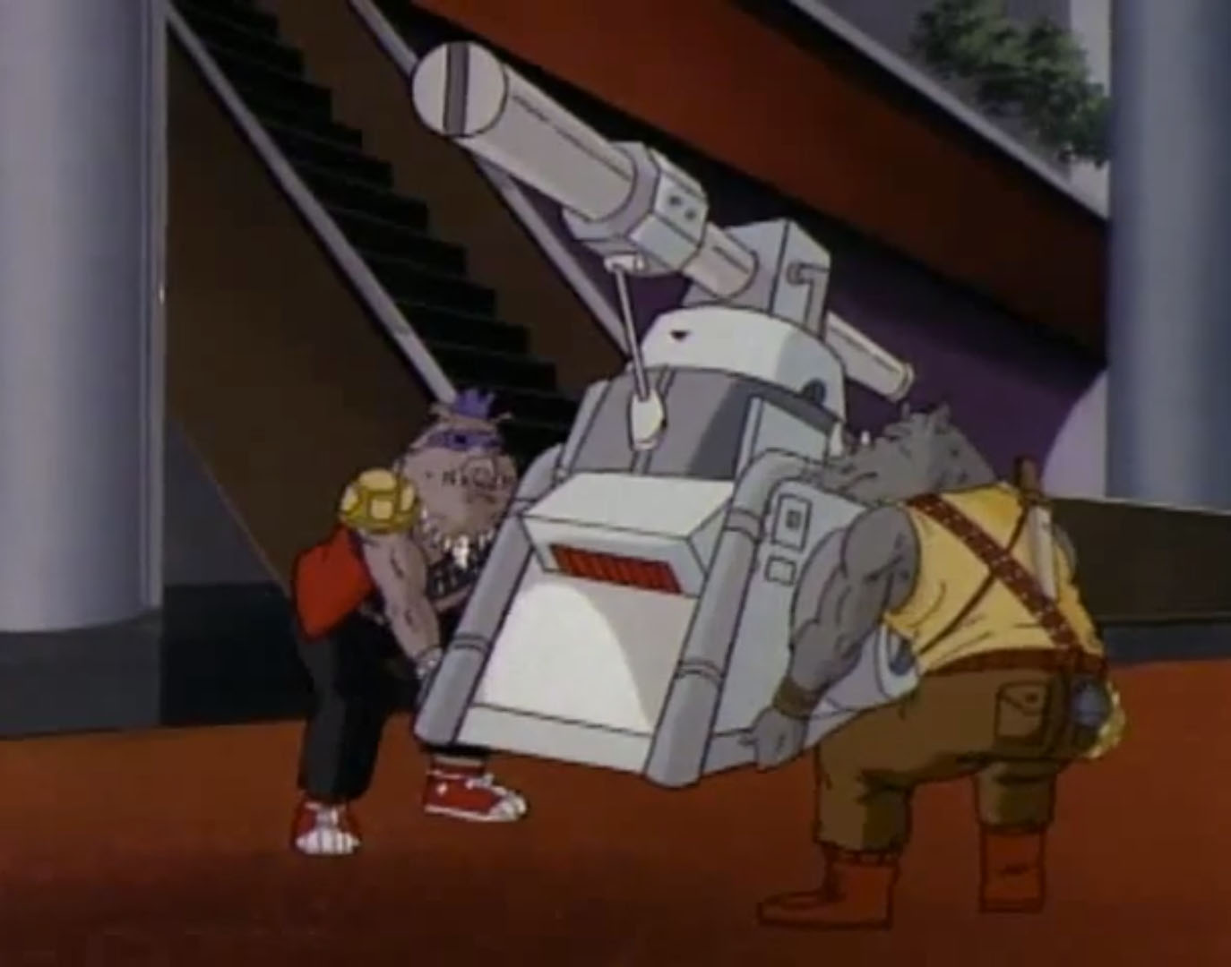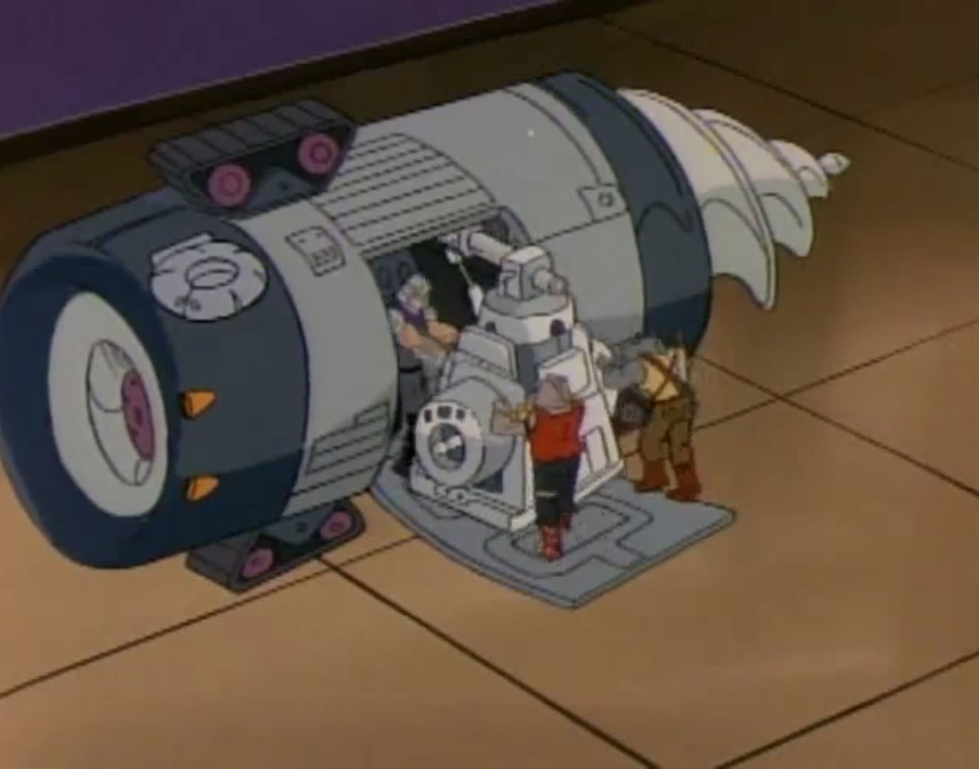 les tortues interrompaient Krang et Shredder. Michaelangelo se précipitait pour libérer leur amie tandis que Donatello tentait d’annuler le rayon du Technodrome. Il posait le bateau au beau milieu d’une rue.