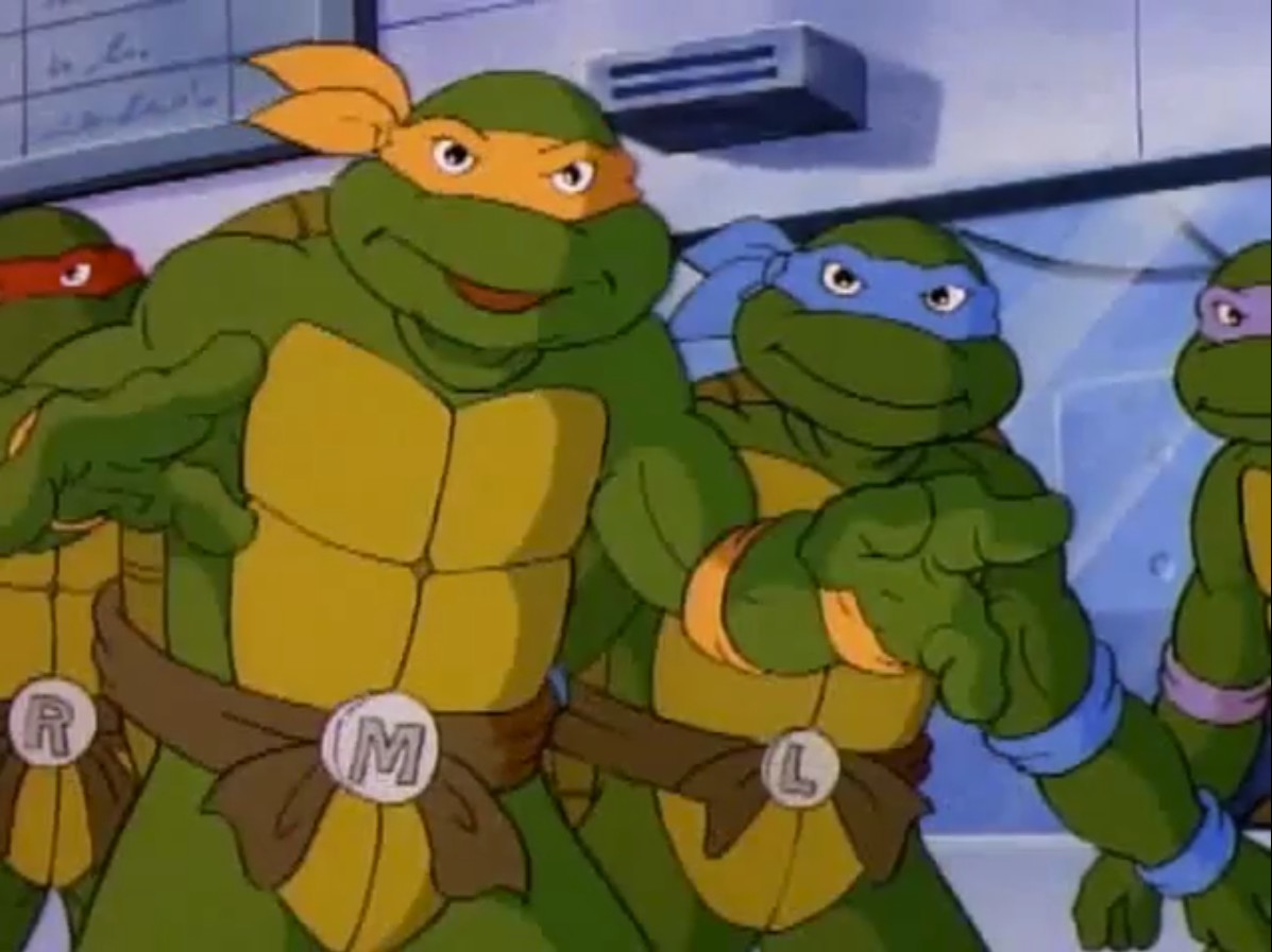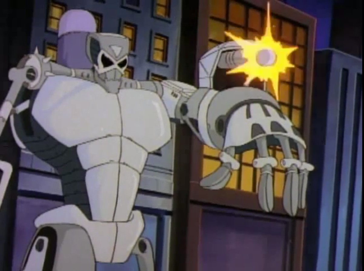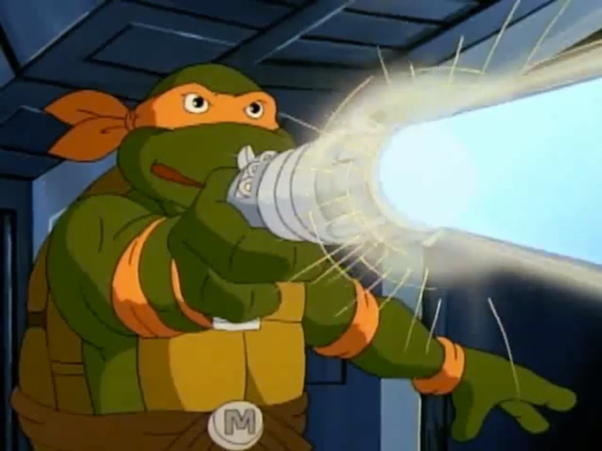 Sans perdre de temps, les tortues sautaient sur la machine pour l’arrêter. Elle en voulait clairement à Kerma, ses amis devaient le protéger. Le Destructor X était trop puissant, les mutants battaient en retraite, s’enfonçant dans le vaisseau. Hélas, les tortoïdes n’avaient pas appris de leurs erreurs et Kerma n’était toujours pas armé (La planète des tortues droïdes, part. 2). Le combat contre la machine serait beaucoup plus complexe. C’est alors que Michaelangelo vit un objet ressemblant à un pistolet laser. Le saisissant, il pointait l’arme vers le robot. Il ne s’agissait que d’une lampe de poche. Mais la lumière produite éblouissait l’assaillant. Les cinq tortues en profitaient pour prendre la fuite, hors du vaisseau. Une fois dans la rue, les tortues cherchaient une solution pour vaincre leur ennemi. Michaelangelo suggérait de partir pour Channel 6. Leurs projecteurs devraient les aider à venir à bout du Destructor X.
