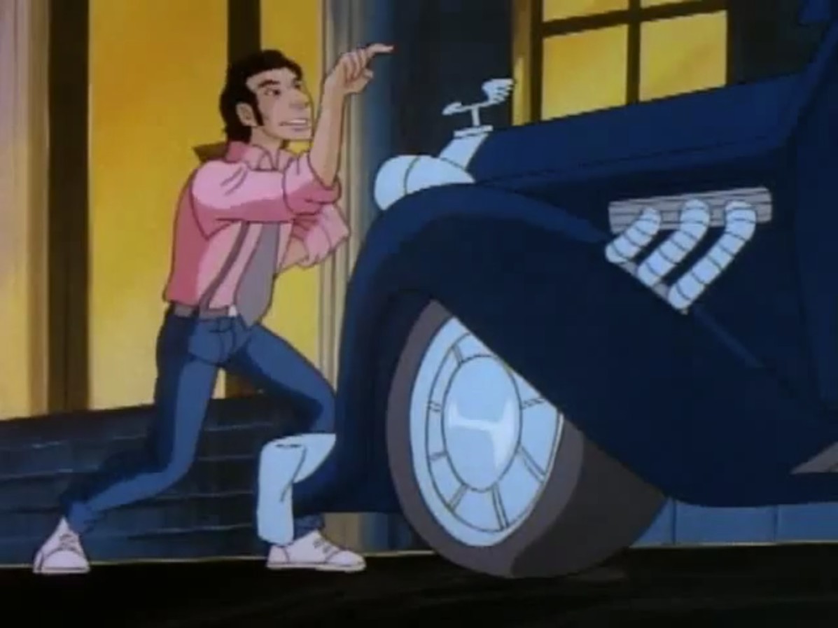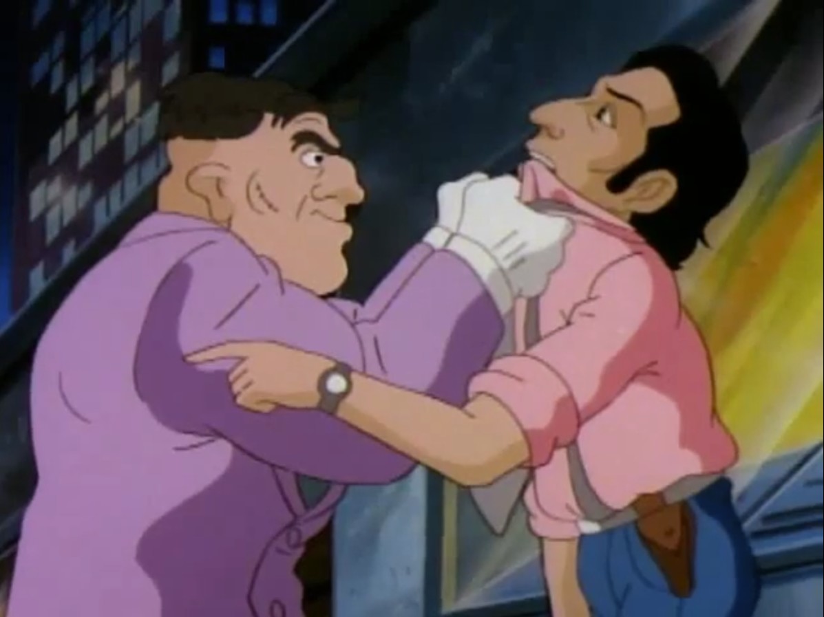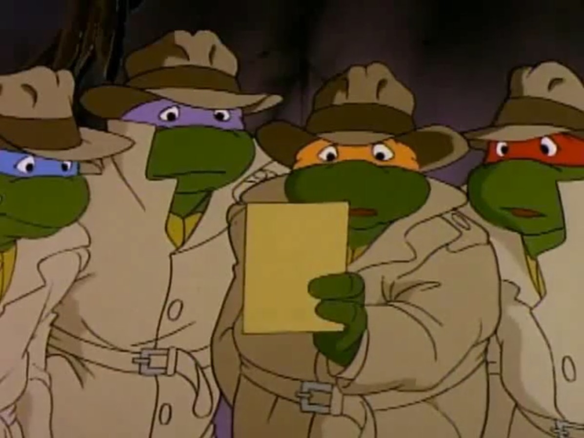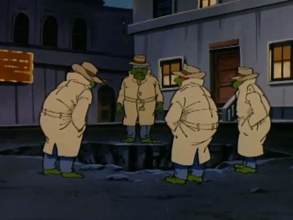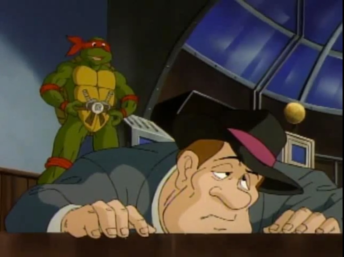 sortait de Channel 6, surpris de voir cinq tortues en trench-coat y entrer. Avait-il raté un épisode ? Poursuivant son chemin à travers les rues de la ville, il était arrêté par Big Louie et ses hommes. Ils savaient qui il était, et qu’il pouvait les conduire aux tortues. Le mafieux désirait se venger des reptiles. Le journaliste, toujours aussi peureux, leur révélait que les mutants venaient d’entrer à Channel 6. Et qu’ils étaient cinq !