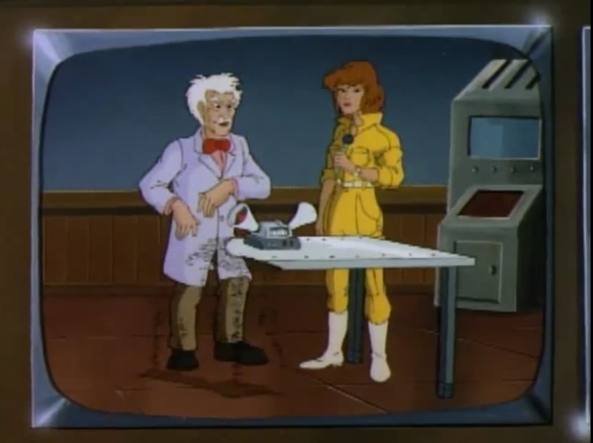 sur la dernière invention du docteur Winston Sturdley, le désintégrateur sonique, un appareil utilisant des ondes très puissantes pour réduire le métal en poussière. Il réalisait une démonstration en direct, réduisant sa montre et la table sur laquelle était posé l’appareil en miette. Donatello était sceptique face à cette invention, mais Leonardo avait un mauvais pressentiment. Il voulait que ses frères et lui se rendent au laboratoire pour garder un œil sur cet appareil.