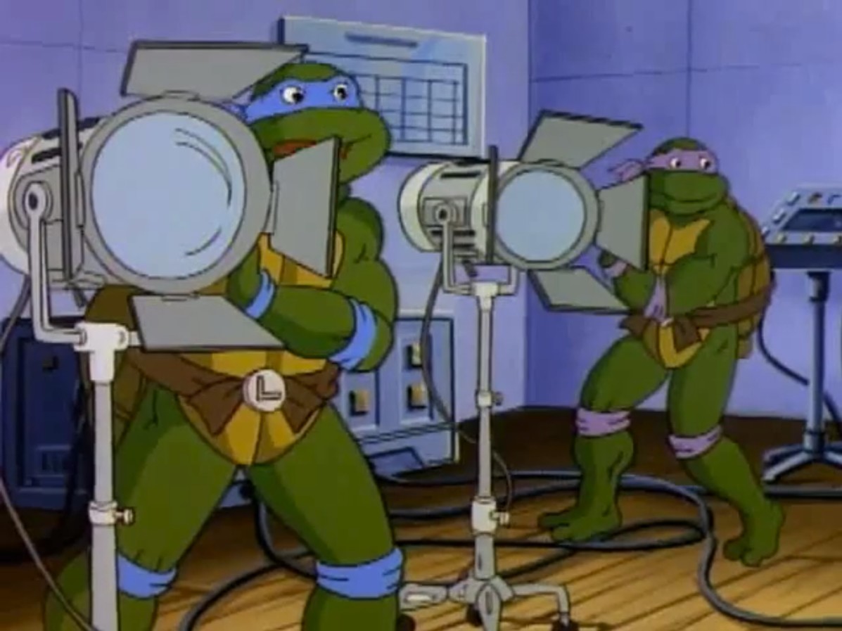 - Dans la version anglaise, après que Michaelangelo ait suggéré de se rendre à Channel 6 pour suggérer d’utiliser les projecteurs, Leonardo dit que son idée est brillante. Il termine en disant « I made a funny ». Il s’agit d’une référence à ce que dit Splinter à la fin des films de la première trilogie, traduit en français par « elle est bien bonne ».
