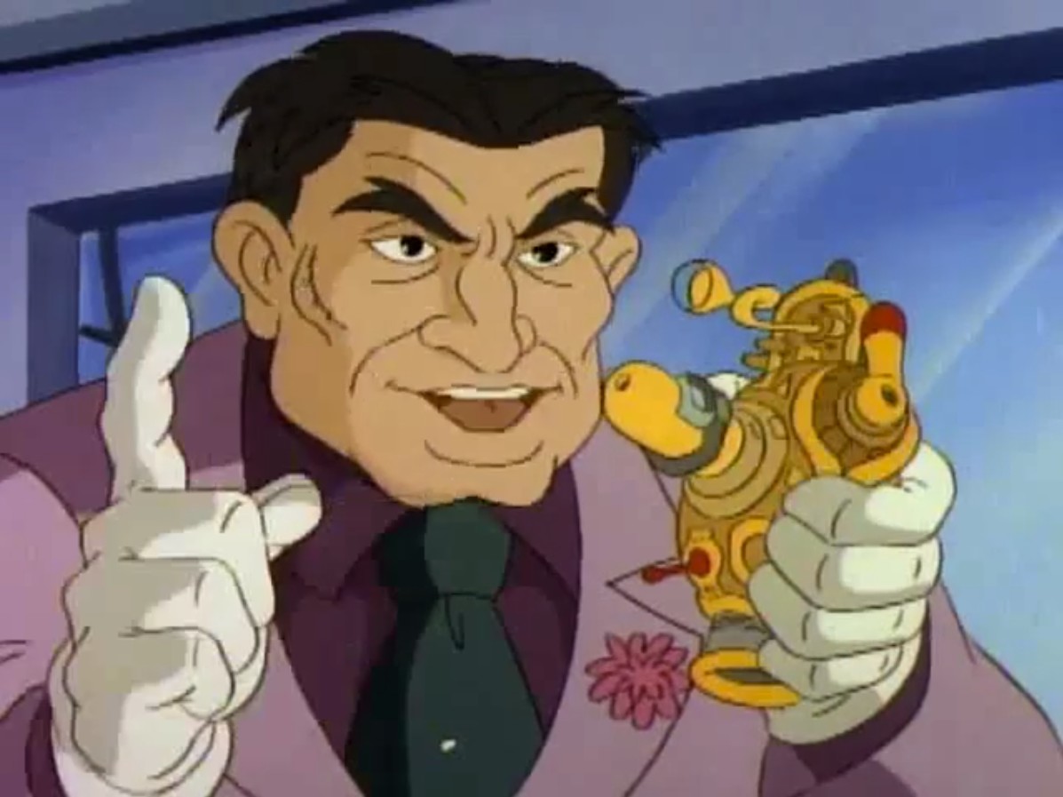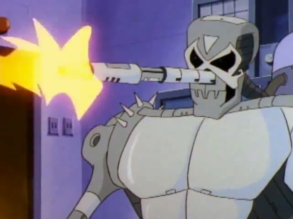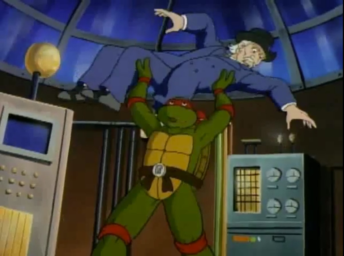 Ses hommes étaient ficelés sur une chaise et subissaient un interrogatoire. Ils révélaient aux tortues qu’il voulait dérober une banque avec cet appareil. Entendant la police arriver, les mutants prenaient la fuite.