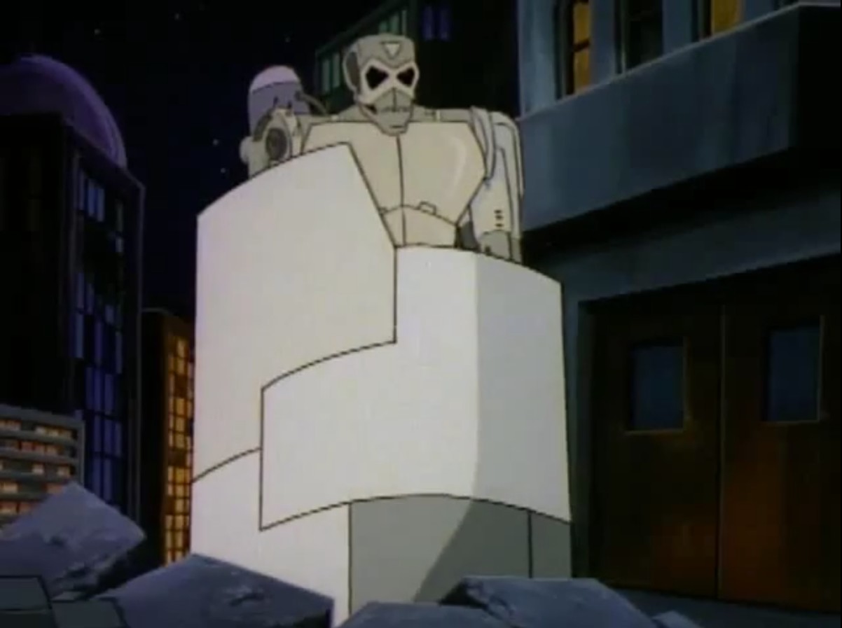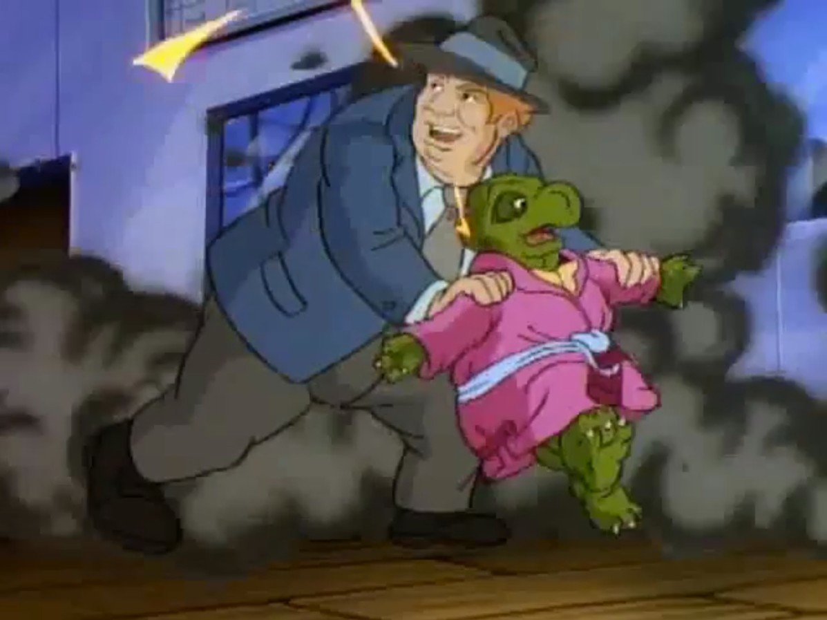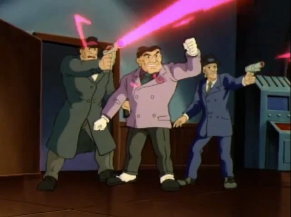 Ses hommes étaient ficelés sur une chaise et subissaient un interrogatoire. Ils révélaient aux tortues qu’il voulait dérober une banque avec cet appareil. Entendant la police arriver, les mutants prenaient la fuite.