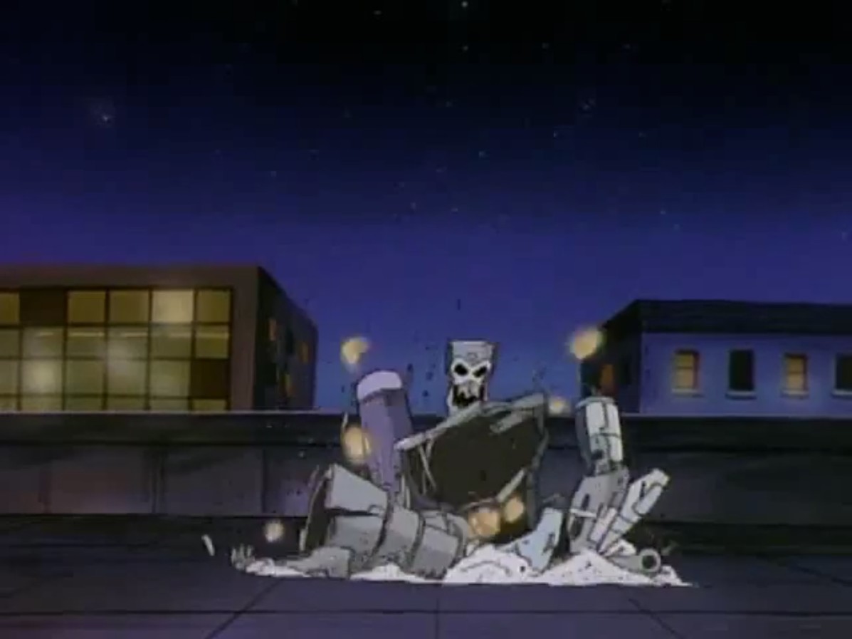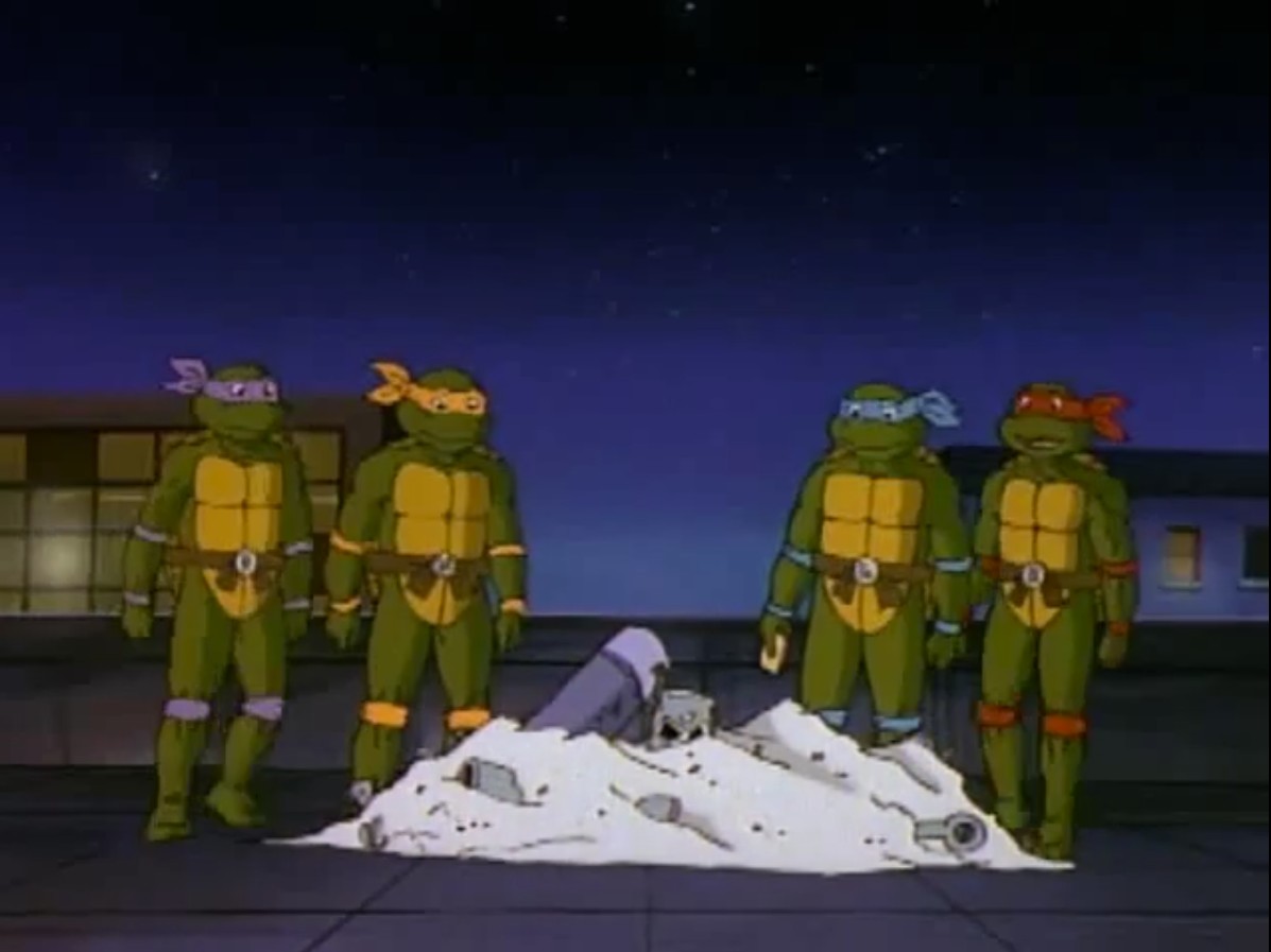 Donatello et Michaelangelo retournaient au laboratoire pour emprunter la machine. Ils devaient vite retourner à la maison d’April. Le Destructor X tirait à l’aveuglette jusqu’à utiliser son lance-flamme pour détruire la peinture qui gênait son champ de vision. Sans perdre de temps, Splinter sautait au visage de la machine pour lui mettre un tissu devant les yeux. Les deux amis regagnaient au plus vite le toit. April essayait de le ralentir avec le flash de son appareil photo, en vain. La machine était à présent au sommet de sa maison et tirait sur le lit où se reposait Kerma. Il explosait en miettes. Le rat avait caché la tortue derrière l’escalier de secours. Alors que le Destructor X s’apprêtait à faire feu de toute sa puissance, les tortues intervenaient. Donatello plaçait le désintégrateur dans le canon de la machine, la réduisant en poussière.