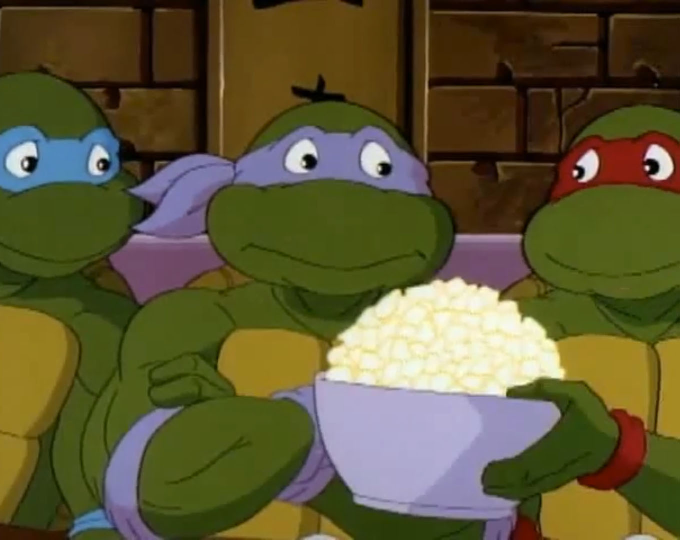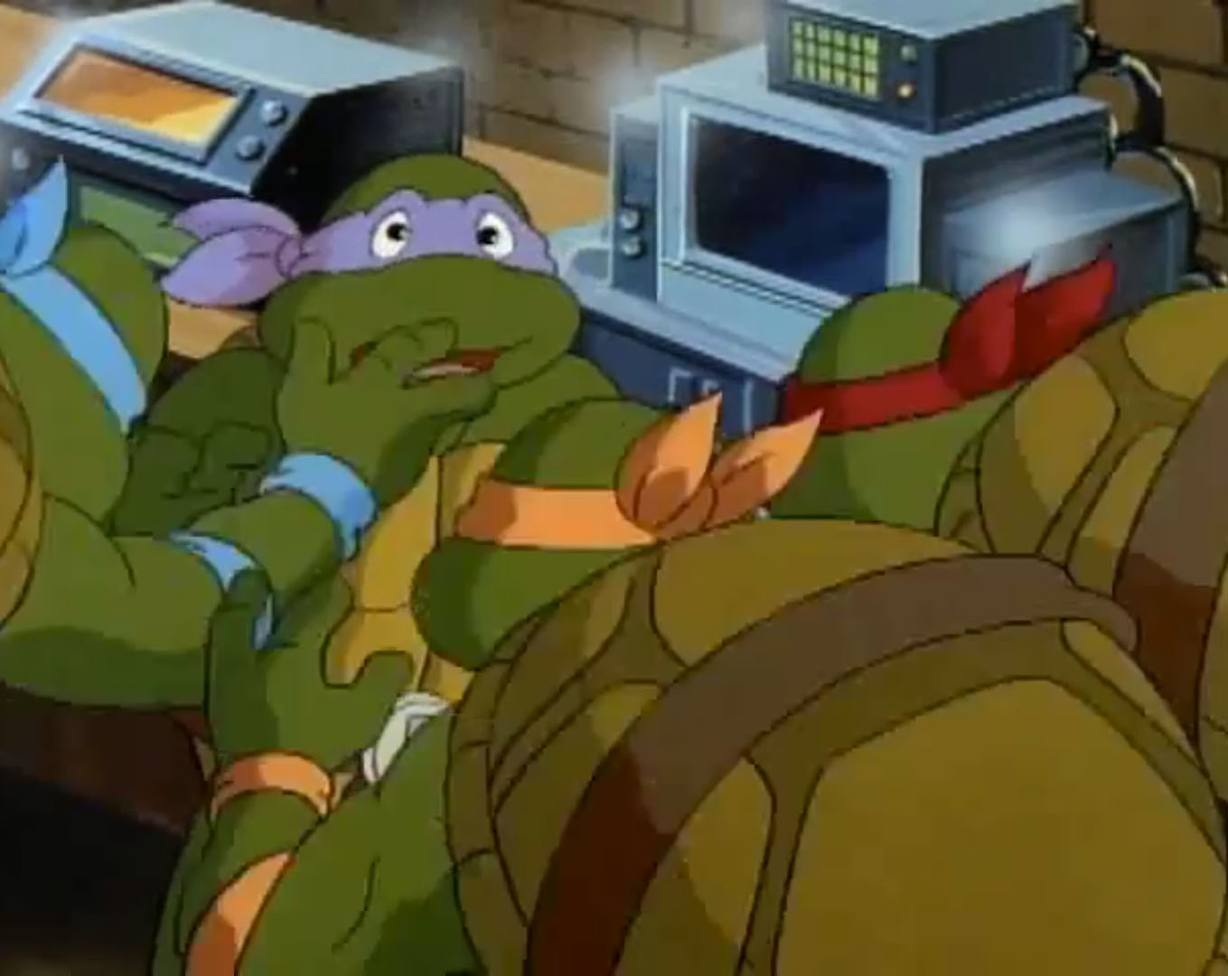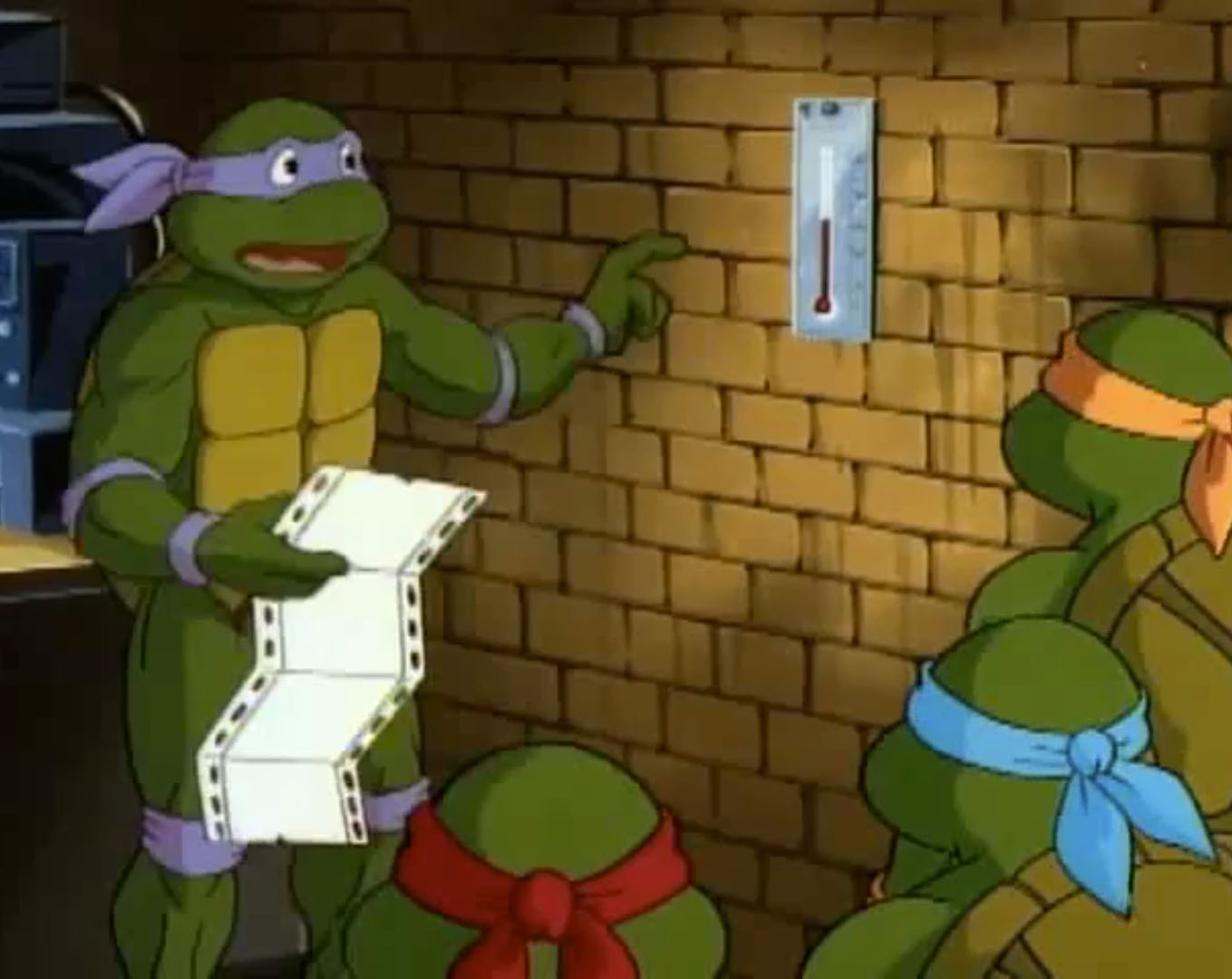 Leonardo enfournait une VHS dans le magnétoscope. Il avait hâte de découvrir ce nouveau film et envoyait le boîtier à Raphael qui en lisait le synopsis. Des petits reptiles qui mutent en super-héros ! Et Michaelangelo arrivait au même moment, les bras chargés de popcorn et de boissons. Il ne manquait que Donatello, terriblement occupé dans son laboratoire ces derniers temps. Les frères lui rendaient visite et lui proposaient de les rejoindre. Mais le génie de la bande n’avait clairement pas le temps. Il semblait même très préoccupé. Quelque chose se produisait dans l’atmosphère, il préférait garder un œil sur cet évènement inexpliqué. Alors que Raphael se moquait de lui, la tortue recevait les résultats des derniers scanners qu’il avait effectués. La Terre était en train de changer d’orbite et se rapprochait du soleil ! Ils étaient déjà à 2°C au-dessus de la norme. Donatello craignait qu’à terme, la planète termine dans le soleil. Mais les autres tortues ne prenaient pas ses inquiétudes au sérieux. Ils ne se rendaient pas compte de ce que cela signifiait et le saisissaient pour le jeter sur le canapé, dans le salon. Le génie ne s’y conformait pas, mais après tout, il pouvait bien se détendre une petite heure avant de repartir au travail. Hélas pour lui, le film s’intitulait « Le jour où la Terre percutait le Soleil ». C’en était de trop, Donatello se levait brusquement et filait sauver la planète. Les autres tortues tombaient à la renverse, avec le canapé.