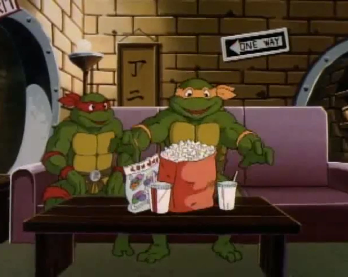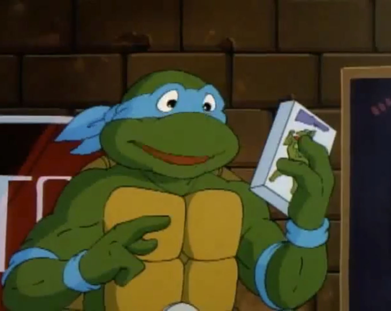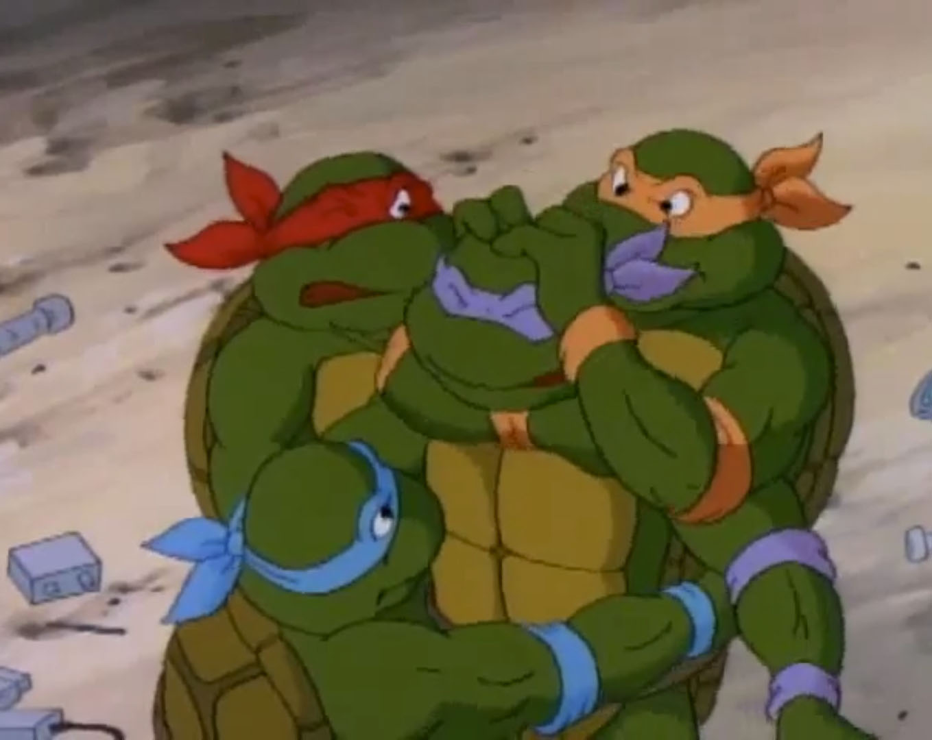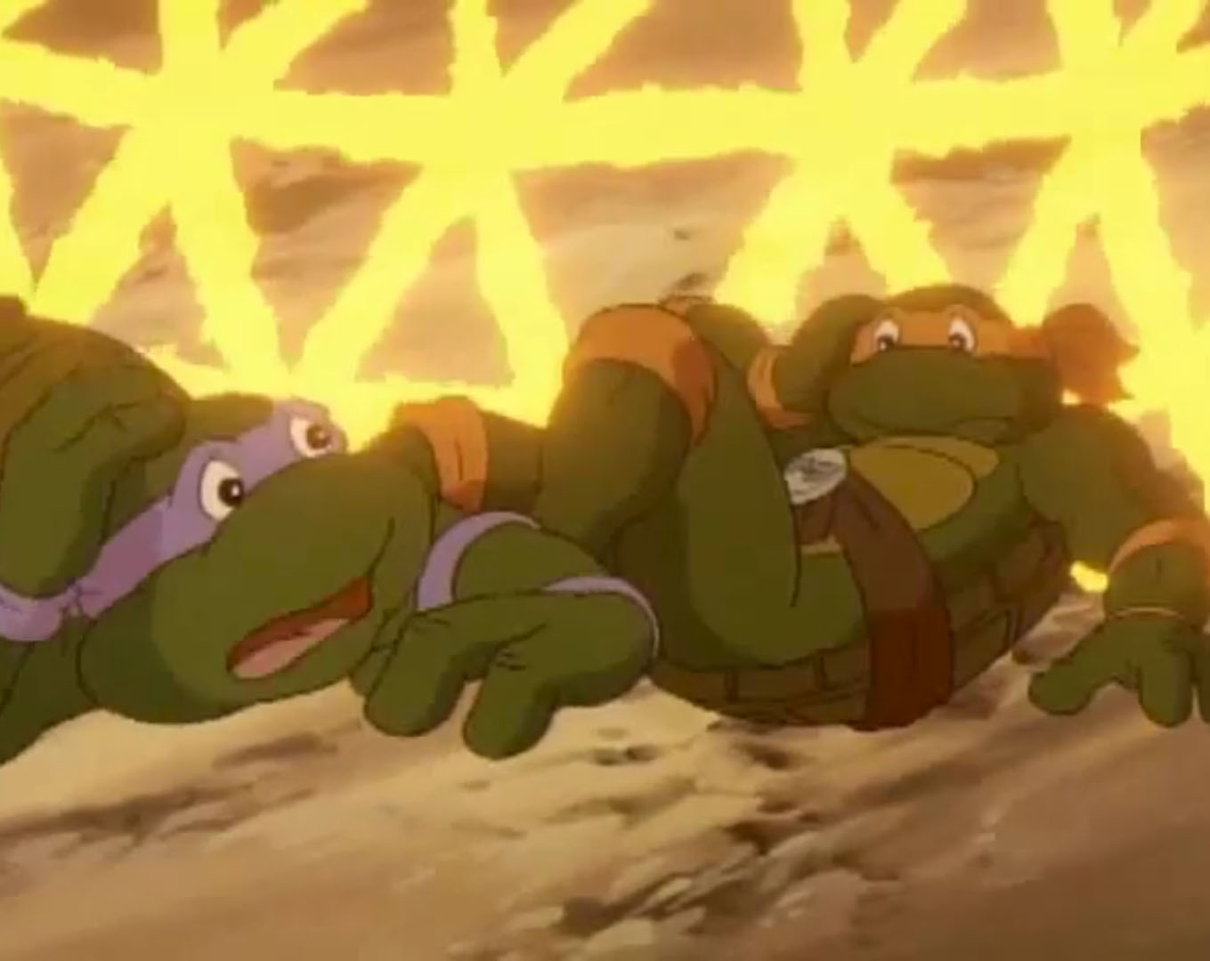 Leonardo enfournait une VHS dans le magnétoscope. Il avait hâte de découvrir ce nouveau film et envoyait le boîtier à Raphael qui en lisait le synopsis. Des petits reptiles qui mutent en super-héros ! Et Michaelangelo arrivait au même moment, les bras chargés de popcorn et de boissons. Il ne manquait que Donatello, terriblement occupé dans son laboratoire ces derniers temps. Les frères lui rendaient visite et lui proposaient de les rejoindre. Mais le génie de la bande n’avait clairement pas le temps. Il semblait même très préoccupé. Quelque chose se produisait dans l’atmosphère, il préférait garder un œil sur cet évènement inexpliqué. Alors que Raphael se moquait de lui, la tortue recevait les résultats des derniers scanners qu’il avait effectués. La Terre était en train de changer d’orbite et se rapprochait du soleil ! Ils étaient déjà à 2°C au-dessus de la norme. Donatello craignait qu’à terme, la planète termine dans le soleil. Mais les autres tortues ne prenaient pas ses inquiétudes au sérieux. Ils ne se rendaient pas compte de ce que cela signifiait et le saisissaient pour le jeter sur le canapé, dans le salon. Le génie ne s’y conformait pas, mais après tout, il pouvait bien se détendre une petite heure avant de repartir au travail. Hélas pour lui, le film s’intitulait « Le jour où la Terre percutait le Soleil ». C’en était de trop, Donatello se levait brusquement et filait sauver la planète. Les autres tortues tombaient à la renverse, avec le canapé.