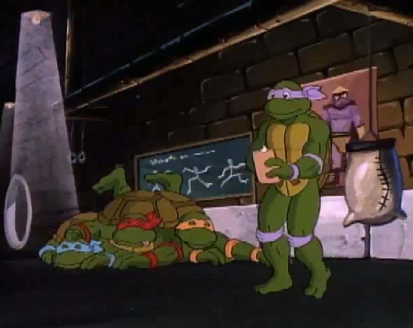 De retour dans son laboratoire, Donatello s’inquiétait de plus en plus. La température était montée à 4°C au-dessus des normales ! Ses frères ne le comprenaient toujours pas. Pour Michaelangelo ce n’était d’ailleurs pas plus mal. Plus il y avait de soleil et plus ils pourraient aller à la plage ! Inquiètes pour leur frère, les tortues allaient s’entretenir avec Splinter et lui expliquaient la situation. En réponse, le rongeur proposait un entraînement pour se changer les esprits. Donatello n’y réchapperait pas. La tortue posait son calepin et faisait les premiers mouvements avant de sauter sur ses frères et de les maîtriser. Après cela, elle reprenait son calepin et retournait à ses observations.