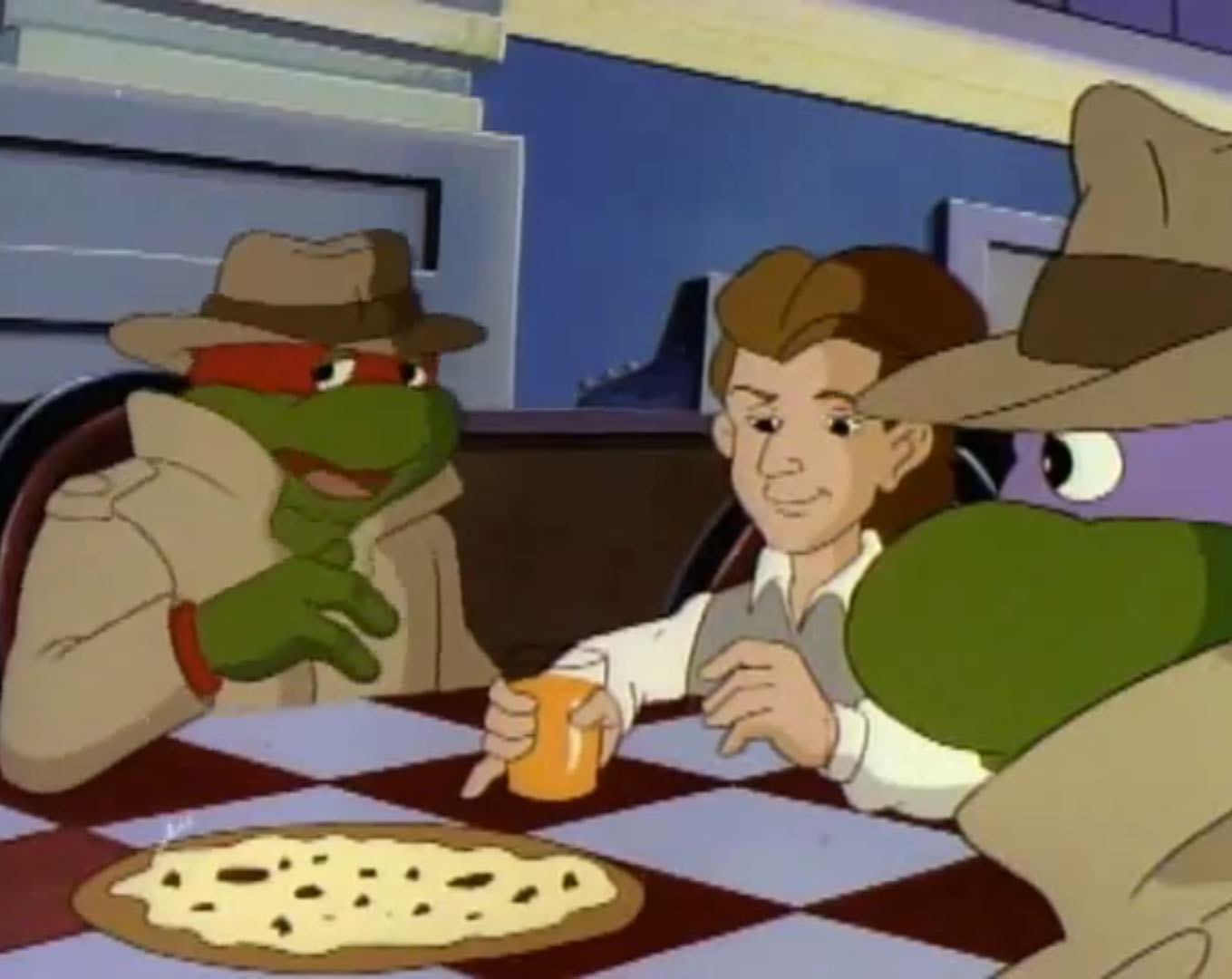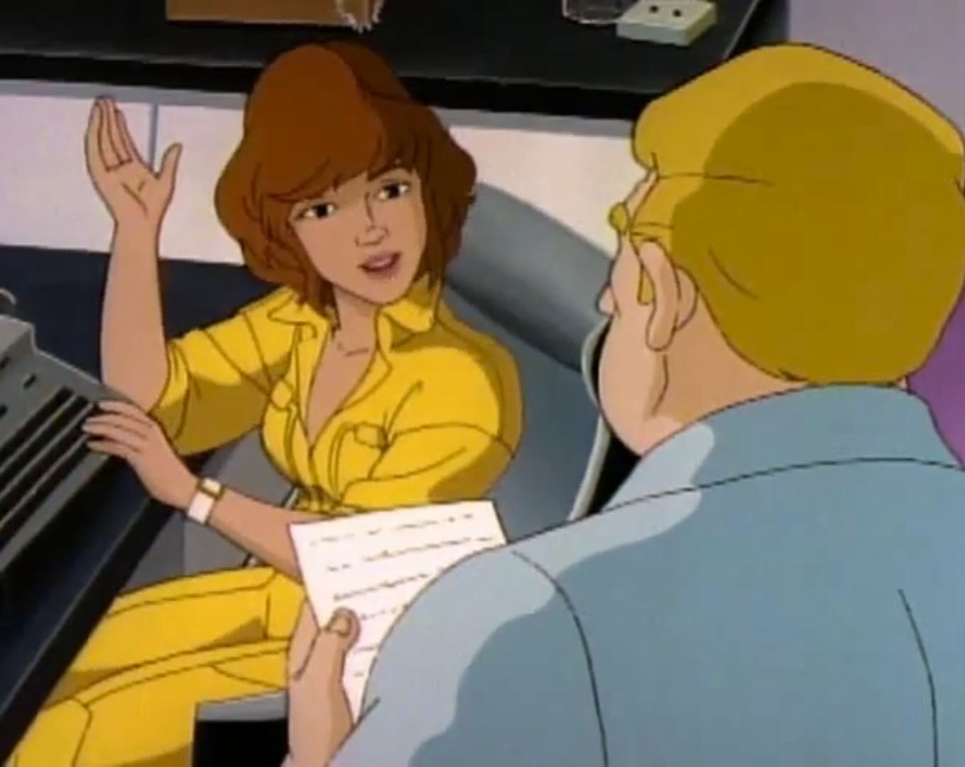 Burne Thompson entrait dans le bureau d’April pour lui demander de couvrir un nouvel évènement, quand elle aurait terminé son reportage sur l’invasion de rats à la mairie. Ce n’était pas une invasion extraterrestre ou d’autres sujets palpitants. Simplement le concours de science. Vernon ne pouvait-il pas y aller à sa place ? En réalité, le journaliste était bien trop occupé à… Nettoyer la voiture de son rédacteur en chef. Vernon entrait justement en annonçant qu’il avait terminé sa tâche. Une fois le chef parti, il suppliait April de proposer aux tortues de rencontrer son neveu. Il s’était mis dans de beaux draps en lui disant qu’il les connaissait un peu trop bien… Trop gentille, April acceptait. Il fallait surtout qu’elle ramène Donatello pour le concours de sciences.