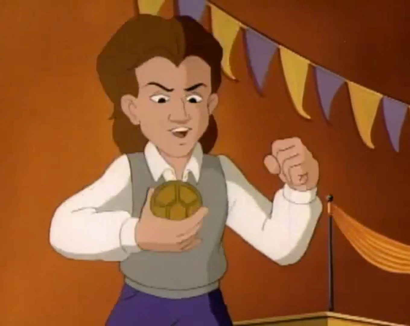 April réalisait son reportage en direct du salon. Elle se dirigeait vers Foster Fenwick, qu’elle présentait comme ayant un QI de 271. La journaliste commençait par lui demander qui était le scientifique qu’il préférait. L’enfant répondait immédiatement qu’il admirait le travail du professeur Filo Sopho. Une réponse qui faisait bondir les tortues et April, qui se souvenaient très bien de ce qu’il avait tenté de faire quelques mois auparavant (Un diplôme mérité, S4 E31). Au moment de présenter son aimant solaire, il soulevait le drap qui le recouvrait, pour dévoiler une armature de bois… Où était passée son invention ? Foster commençait à hurler dans tous les sens et à accuser Donatello. Les frères de la tortue lui posaient des questions. Mais le ninja n’y était pour rien et ne comprenait pas ce qu’il se passait. Au même moment, Filo Sopho apparaissait à l’écran, accompagné de l’aimant solaire. Lui se trouvait dans des souterrains. Mais le reste du monde allait griller dans les 12 prochaines heures. Le savant fou les invitait à quitter la Terre s’ils ne voulaient pas être réduits en cendres.