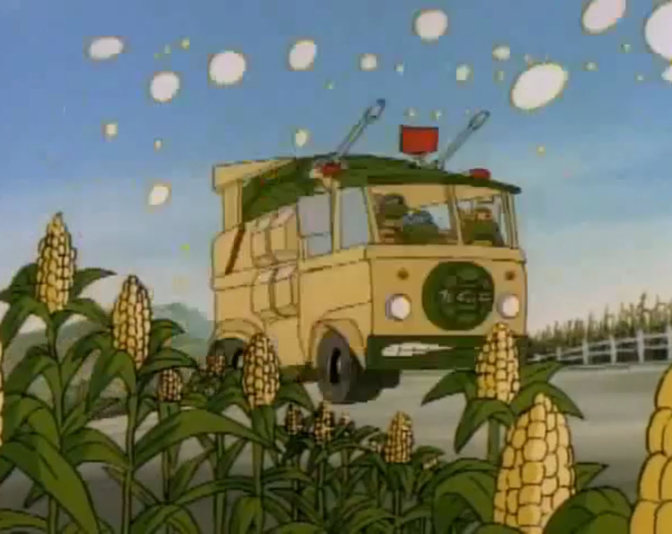 Il faisait de plus en plus chaud. Le Turtle van roulait à toute vitesse dans la campagne mais avait de plus en plus de difficultés à avancer. Le bitume fondait à vue d’œil, empêchant les roues d’avancer. Leonardo pensait à un gadget du véhicule. Des asperseurs de froid placés à l’avant refroidissaient la route. Voilà qui permettait au camion de poursuivre sa route. Les héros traversaient un champ de maïs. Des détonations se faisaient entendre. Du pop-corn en sortait !