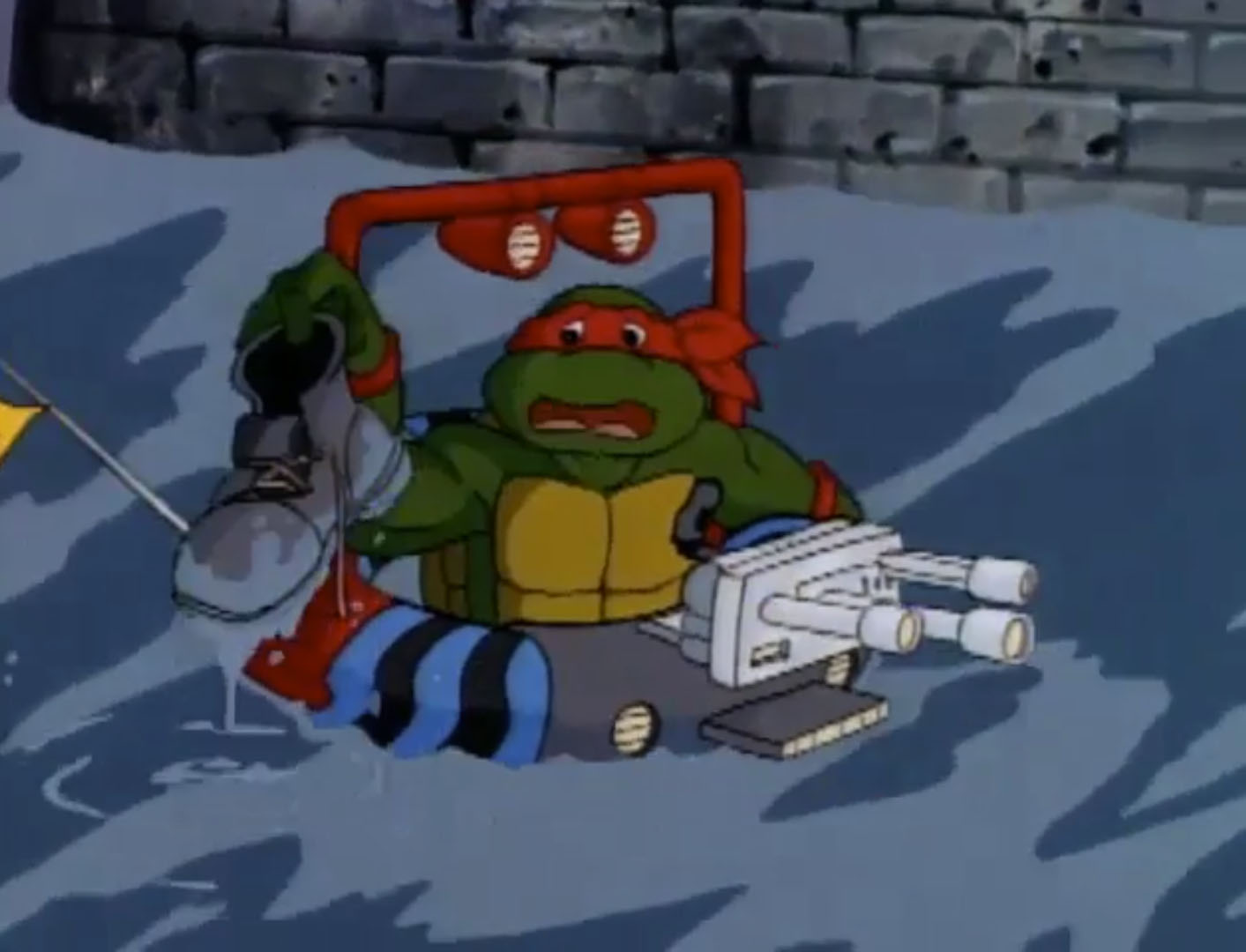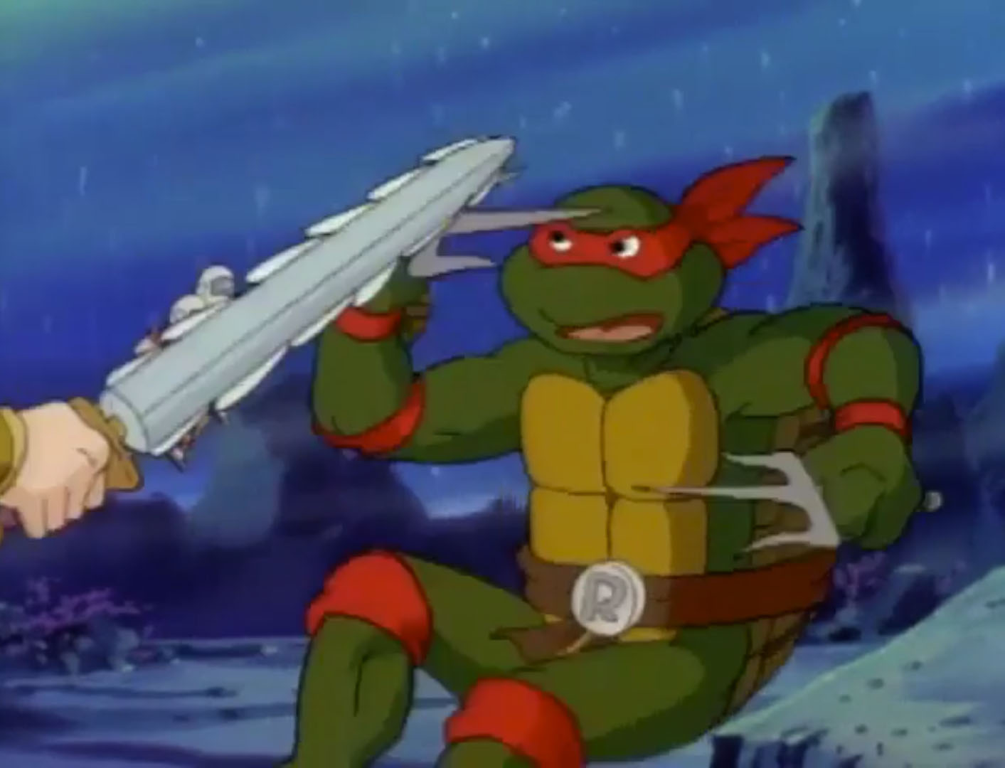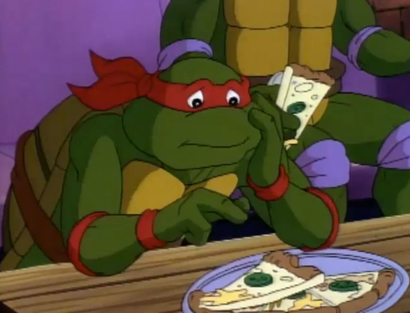 De retour dans les égouts, les quatre frères reparlaient de leur expérience. En l’honneur d’Alim, Michaelangelo avait créé une nouvelle pizza avec des fruits de mer des algues et du poisson. Raphael en avait la nausée !