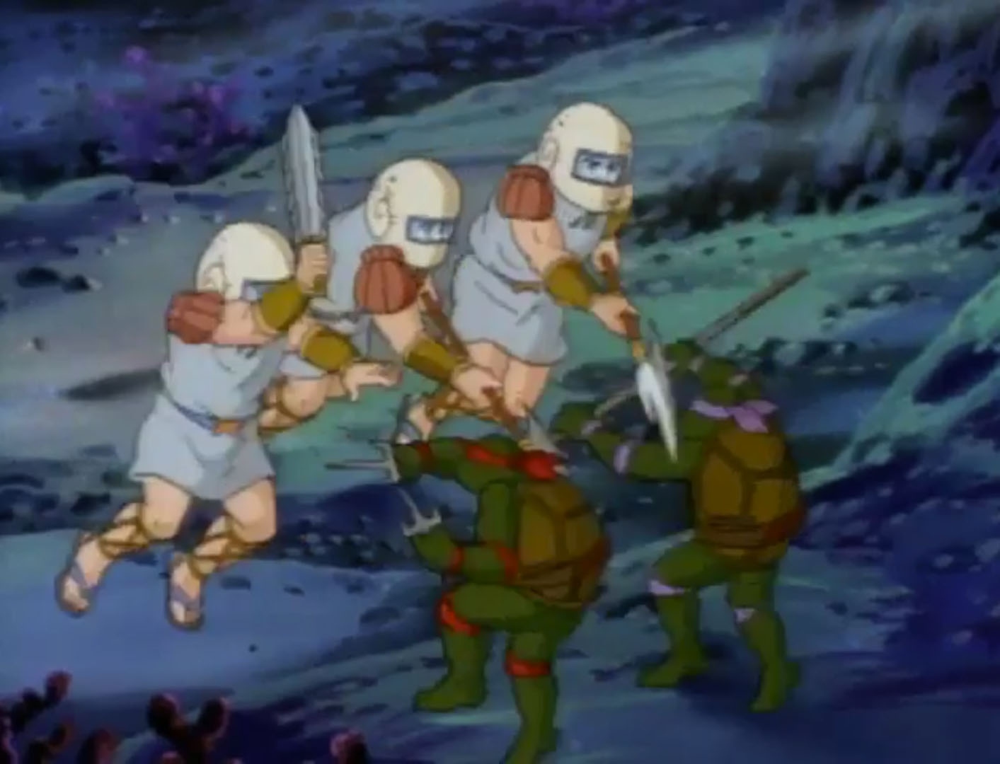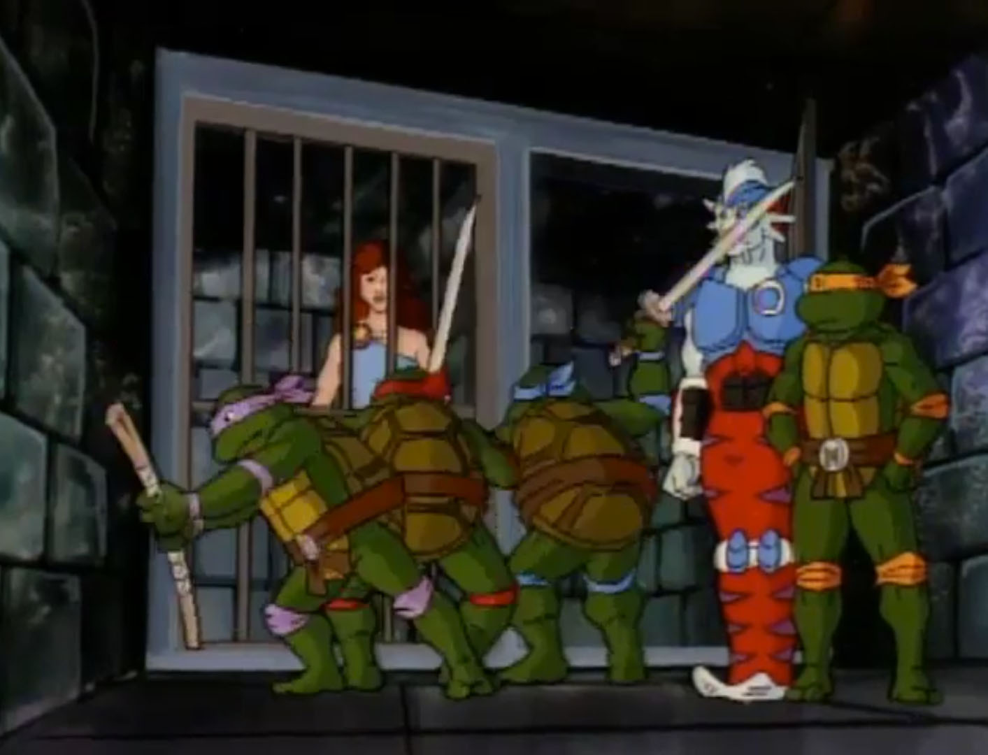 Michaelangelo et Leonardo partaient délivrer Hepax Lagamina. Les gardes neutralisés, les deux frères ne trouvaient pas les clés sur eux… Rocksteady entrait dans la pièce. Il faisait tournoyer le trousseau autour de son index tout boudiné. Le rhinocéros donnait pour une fois du fil à retordre aux deux tortues. Elles préféraient ruser pour le surprendre et le jetaient dans l’une des geôles. Clés en main, elles délivraient Hepax et partaient pour l’arène.