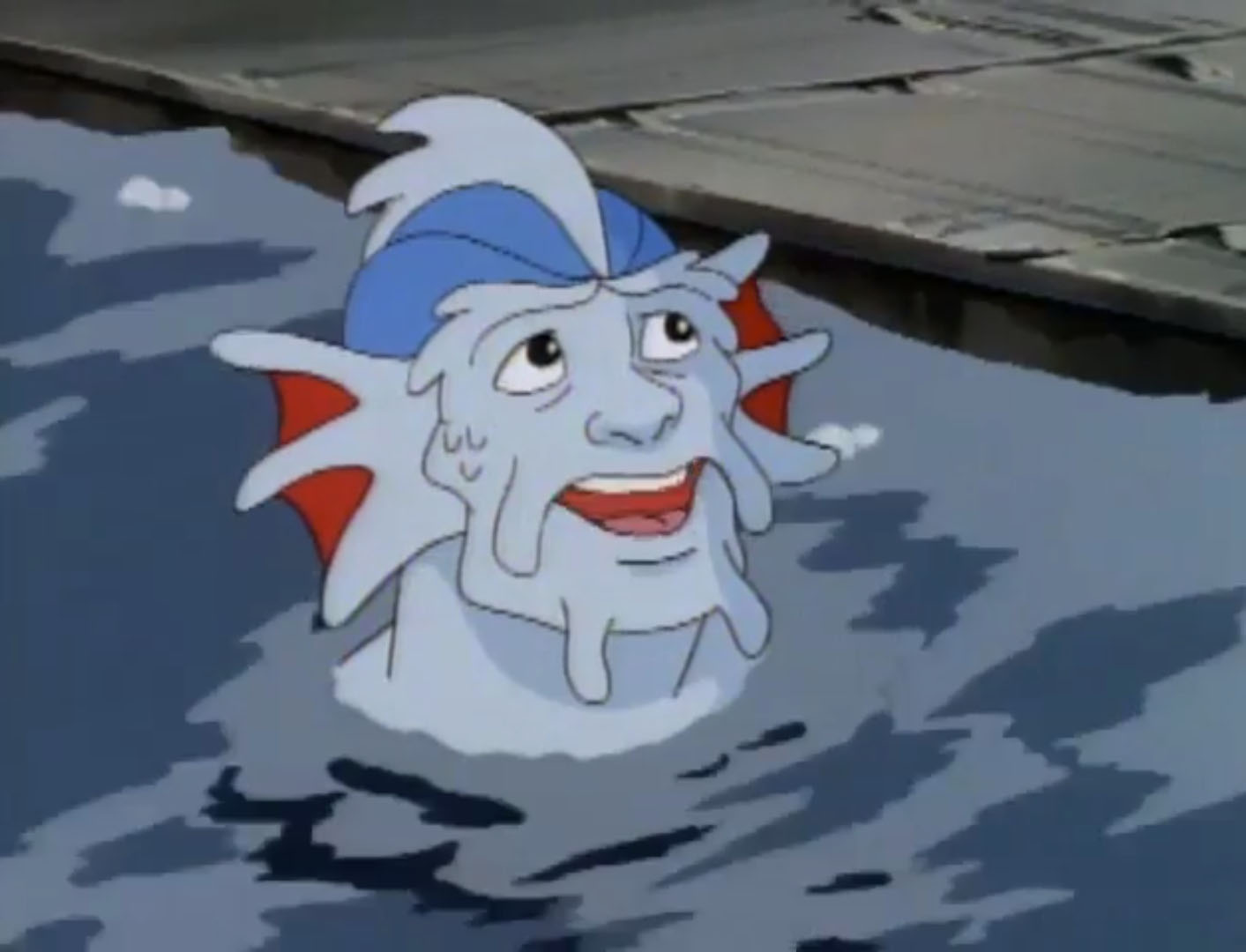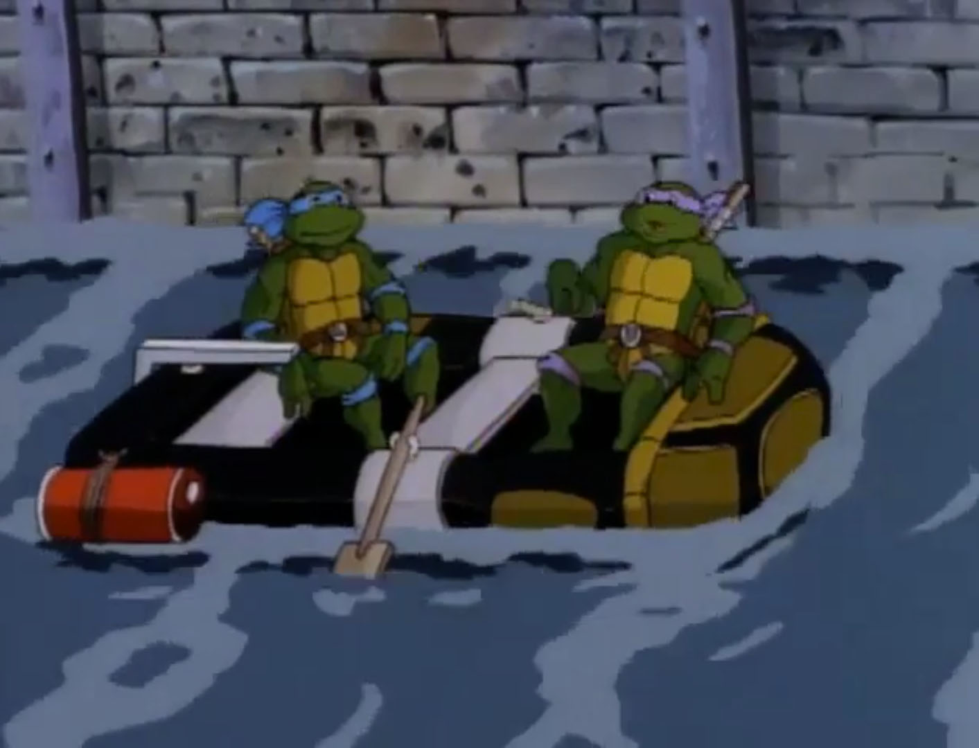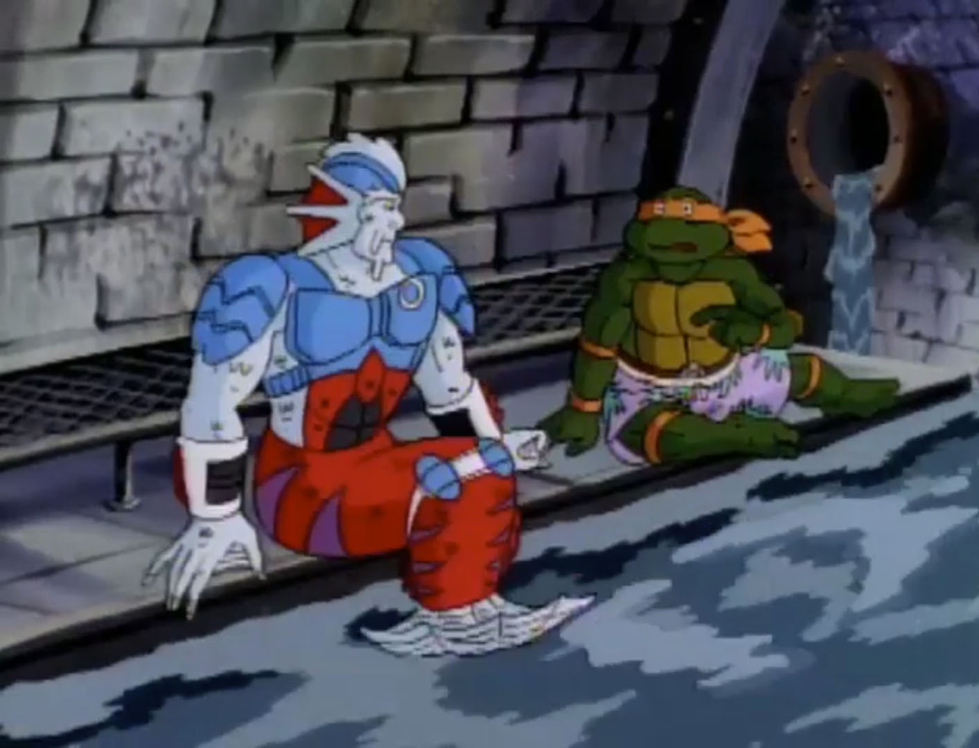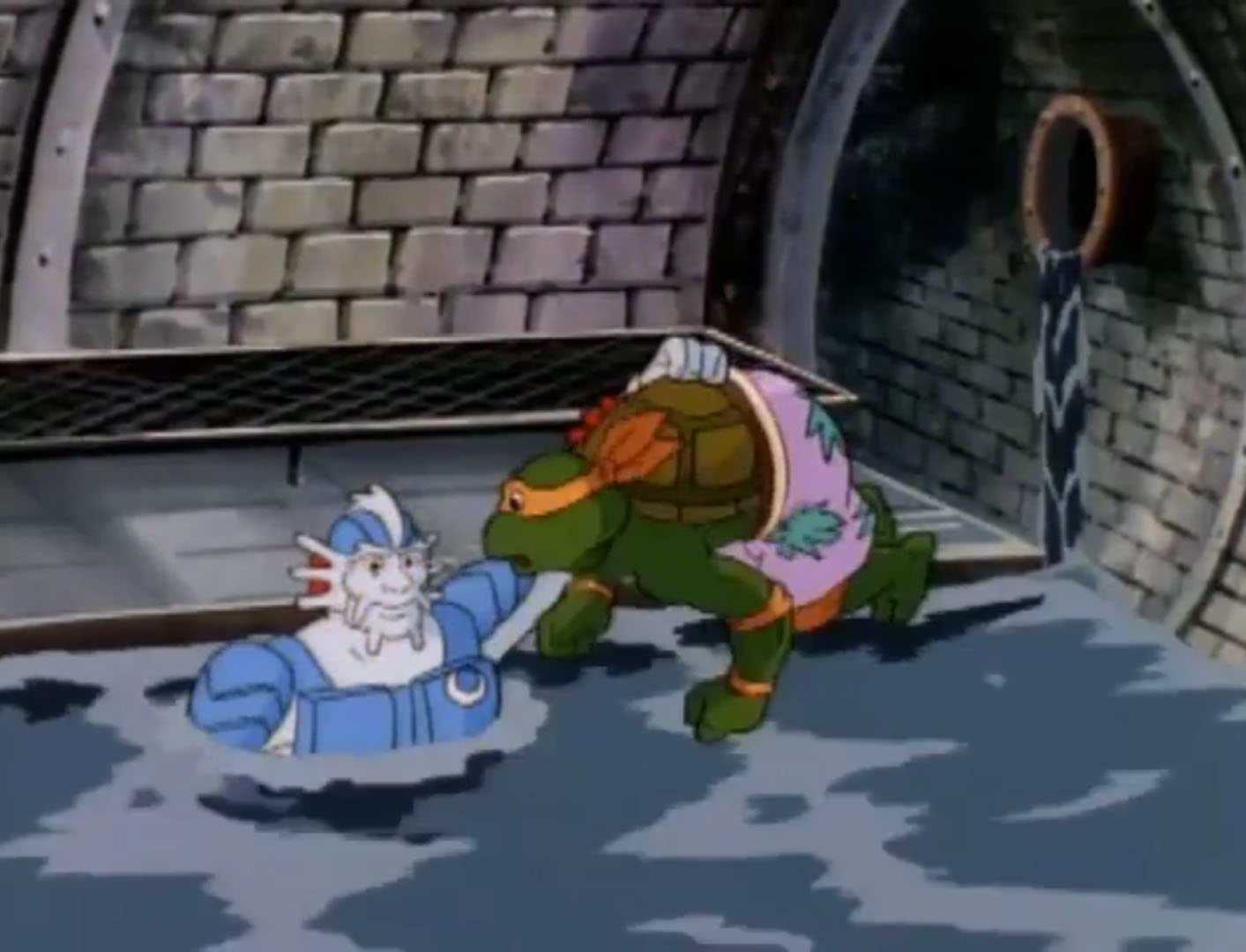 À défaut de pouvoir aller à la plage, les tortues profitaient des courants des égouts pour se laisser aller dans l’eau à bord des Turtles tubes. Michaelangelo défiait les petites vagues sur sa planche de surf et s’enfonçait seul dans les corridors sombres. Mais soudain, il tomba dans un torrent et se faisait emporter. Quelque chose le sortait de l’eau avant qu’il ne s’écrase contre une paroi. Il s’agissait d’une sorte d’homme poisson du nom d’Alim Coelacanth. Ils parlaient, au bord de la rivière souterraine. C’était une sorte de Merdude ! Michaelangelo retournait voir ses frères pour leur annoncer la nouvelle.