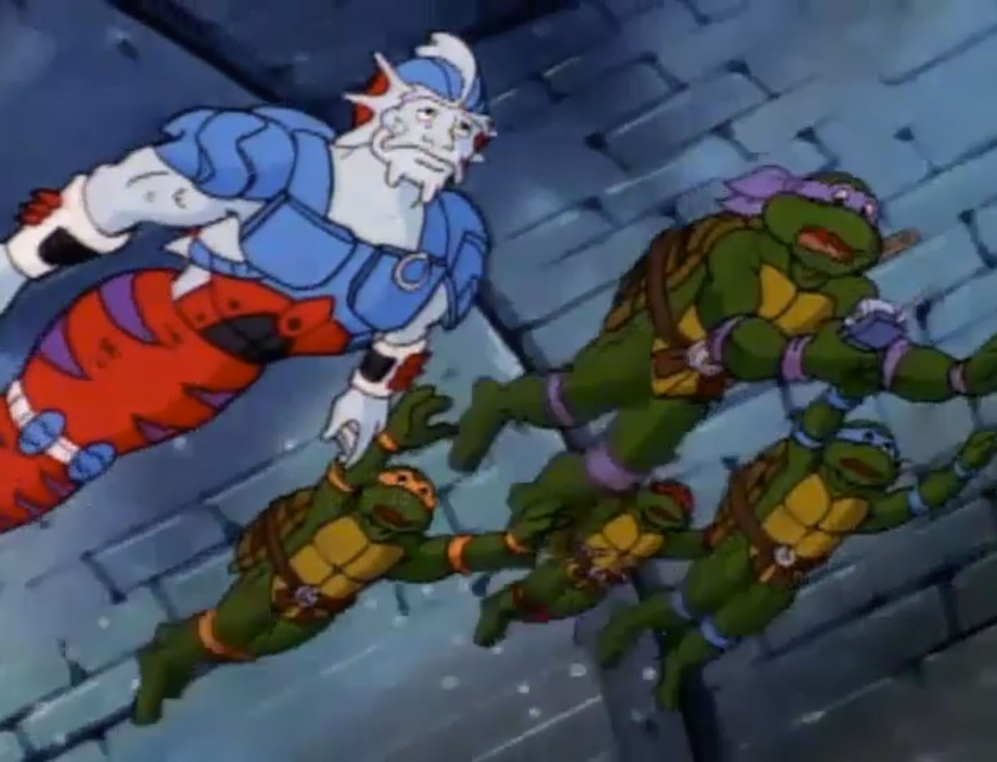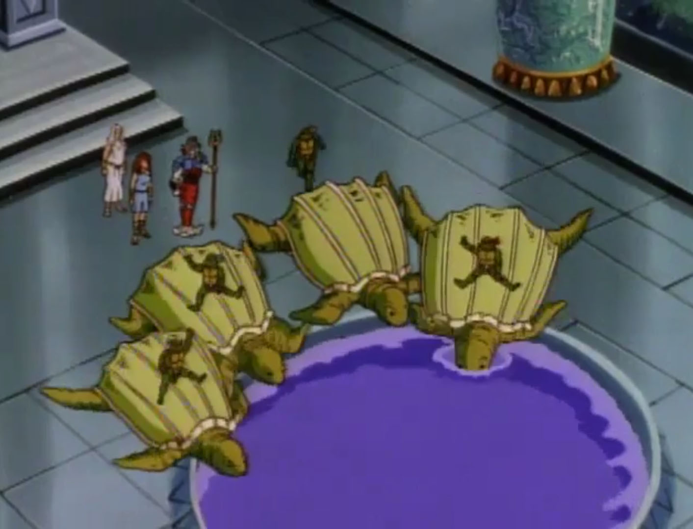 Pendant de ce temps, Bebop était intronisé. Installé sur un trône, une couronne était fixée sur sa tête. La foule l’acclamait. Alim et les tortues arrivaient depuis la fontaine du palais. Ils ne comprenaient pas ce qu’il se passait. Shredder ordonnait que l’on emprisonne les intrus. Les tortues clamaient à l’imposture, mais rien n’y faisait. Sans perdre de temps, les cinq compagnons replongeaient en direction du corridor englouti.
