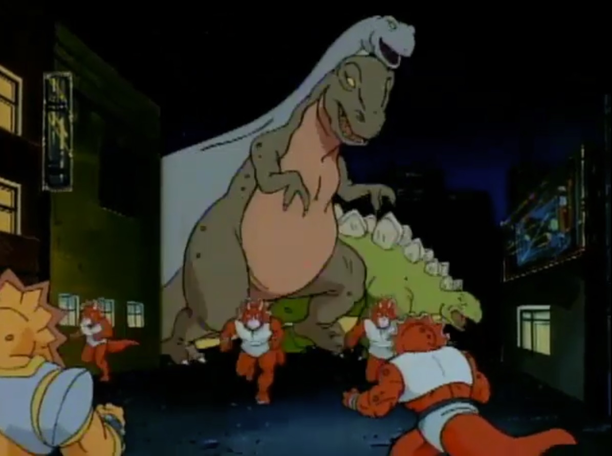 Bientôt, les rues de New York étaient envahies par trois dinosaures gigantesques. Les tortues les commandaient à distance à l’aide de télécommandes. Les robots détruisaient les véhicules des triceratons et leur champ de force qui retenait les civils. Malgré leur politique de non-violence envers les reptiles, les envahisseurs ne tardaient pas à s’attaquer aux géants, découvrant qu’il s’agissait de robots.