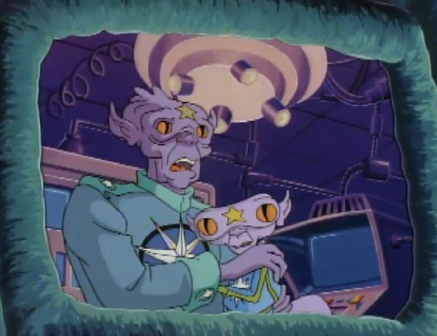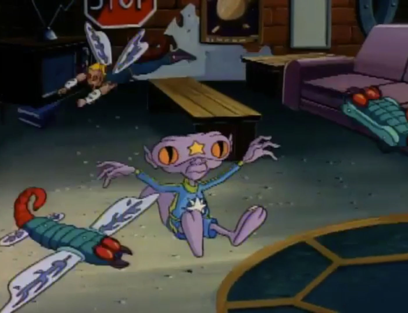 Quarx refusait de répondre aux questions des tortues. Il préférait jouer et bondissait de son fauteuil de commande pour sortir à l’extérieur du vaisseau, en volant ! Il se posait sur un tas d’ordure et commençait à jouer avec les différents rebus. Soudain, un tir faisait éclater des déchets à proximité de la petite créature. Il s’agissait de l’extraterrestre travaillant pour Drako. Donatello saisissait Quarx tandis que ses frères s’occupaient de l’envahisseur. Heureusement pour les ninjas, ses tirs n’étaient clairement pas précis. Solidement ligoté à un grappin, les tortues faisaient tomber un tas d’ordure sur l’agresseur. Au sol mais pas vaincu, il se relevait et chargeait les mutants avant de repartir dans son vaisseau. Que voulait-il à l’accidenté ? Il s’agissait de l’enfant des étoiles, la créature la plus dangereuse de l’univers ! Il ne comptait pas en rester là.