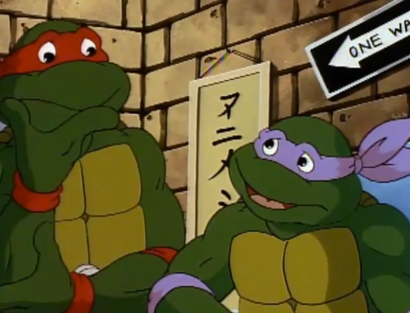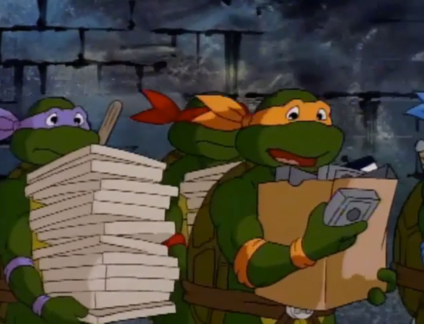 Les tortues revenaient de la boutique de location de cassettes vidéo les bras chargés de films à regarder. De quoi tenir tout un week-end ! Et elles avaient également fait un saut du côté d’une pizzeria.