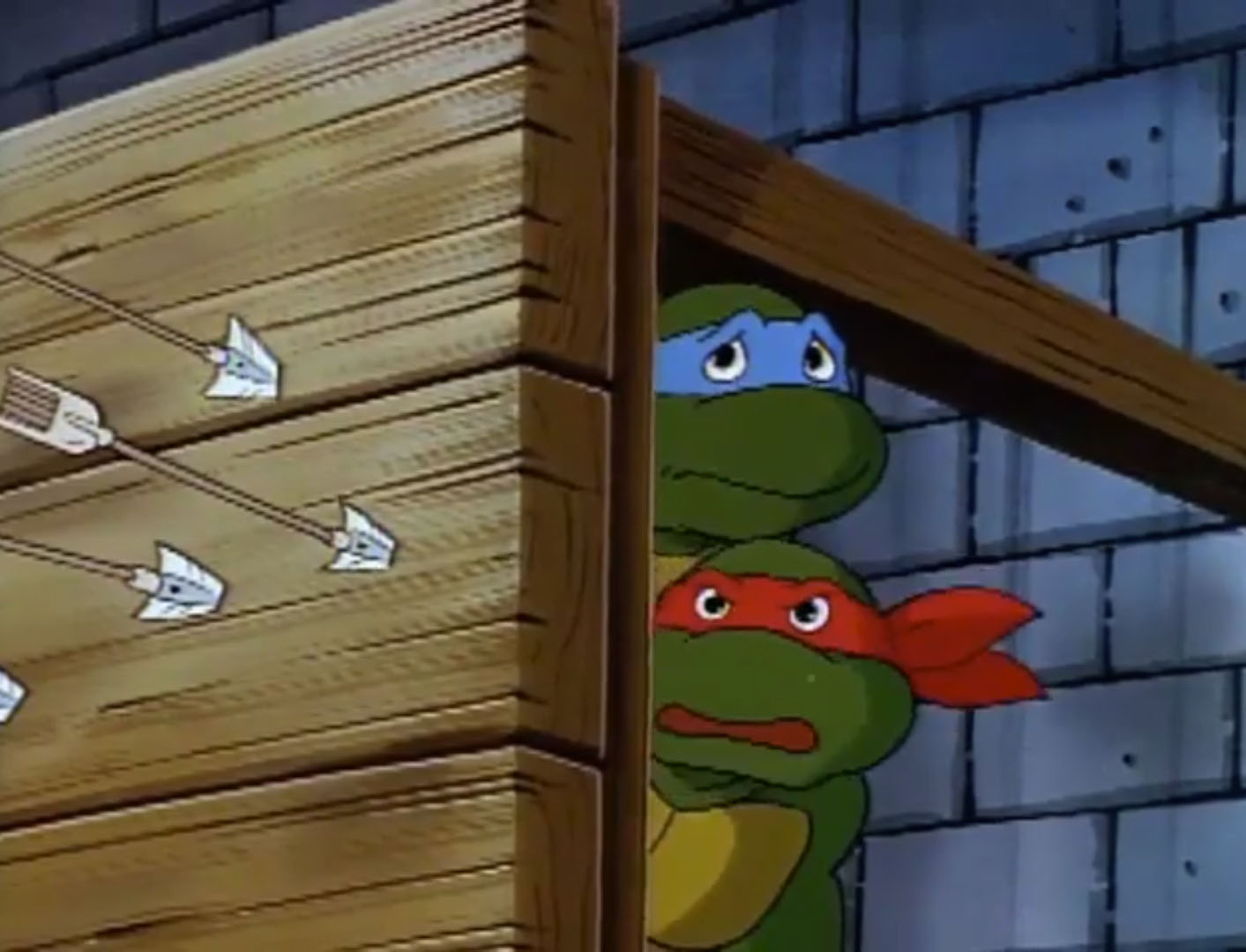 Pendant ce temps, les tortues et April s’étaient cachés derrière une table pour ne pas se faire toucher par les flèches. Donatello et Leonardo saisissaient des éléments du décor pour affronter les robots. Le génie de l’équipe s’emparait de l’une des armes lasers pour les détruite. Rien n’y faisait. Il ne pouvait que tirer sur le décor pour le faire s’effondrer et les tenir à distance. Curieusement, d’autres robots passaient à proximité sans s’intéresser aux tortues. Ils se dirigeaient droit vers la ville !