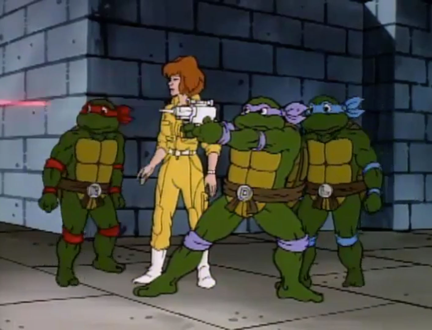 Les autres tortues se retrouvaient à la sortie de leurs parcours. Les frères étaient impressionnés par la qualité des robots. Au même moment, April les retrouvait, leur demandant s’ils avaient vus Irma et Vernon. Les ninjas supposaient qu’ils se trouvaient dans la zone médiévale avec Michaelangelo. Ils partaient tous les quatre à leur recherche. Une fois dans le château, ils trouvaient un lieu vide. Le parc avait beau être immense, il était étrange de ne trouver personne. Irma accourait en leur direction. Elle leur expliquait ce qu’elle avait vu. Alors qu’elle était sur le point de leur révéler le mot de passe qu’elle avait entendu, la jeune femme se faisait enlever par un robot de la zone de Futur Land. D’autres machines approchaient. Les tortues dégainaient leurs armes factices, mais se faisaient attaquer par des robots possédant, eux, de vraies armes.